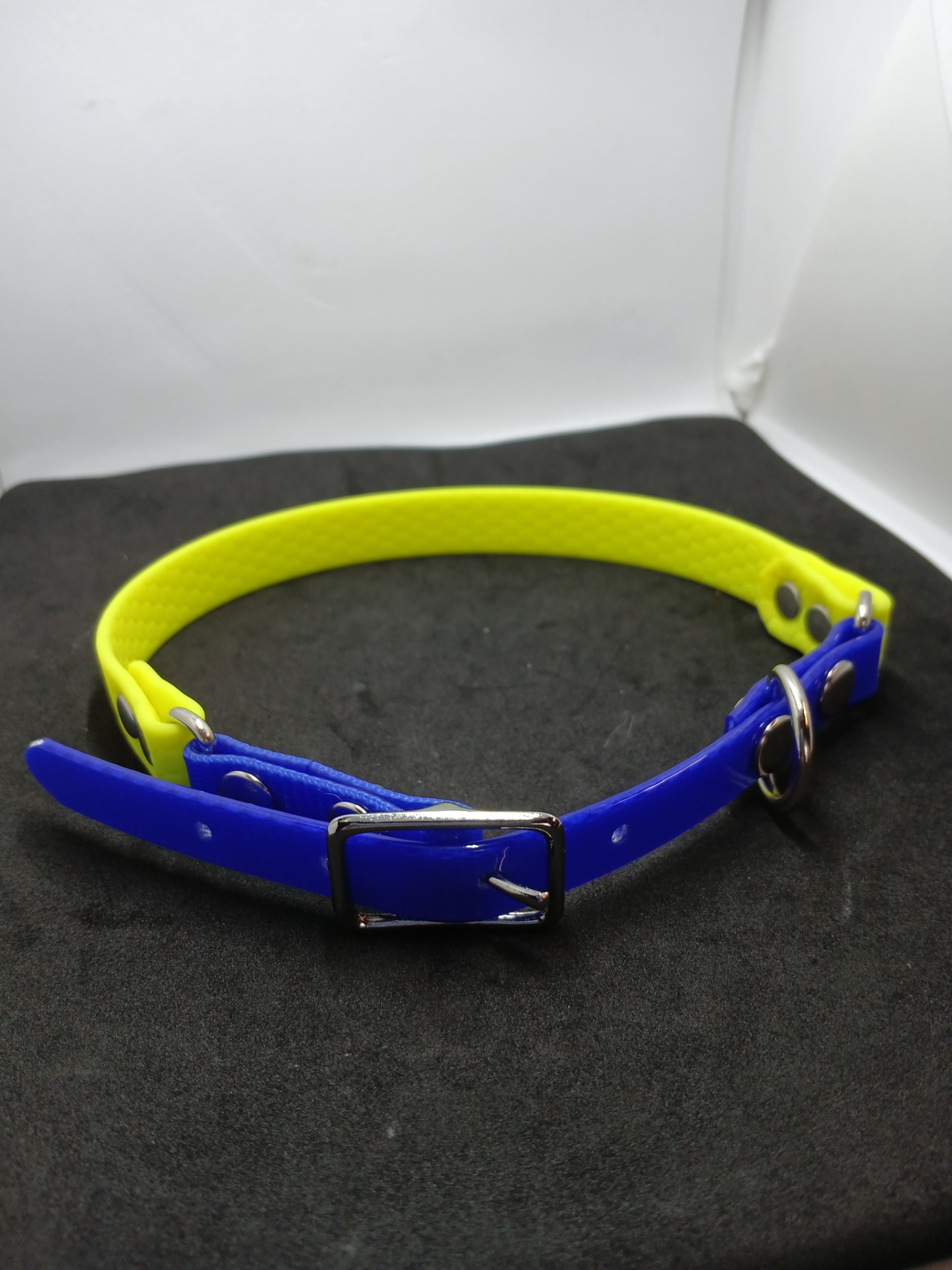 Z voděodolného popruhu Hexa pohodlný obojek s klasickou kovovou sponou . Obvod obojku 38-44 cm , šířka obojku 16mm. Modro žlutý.