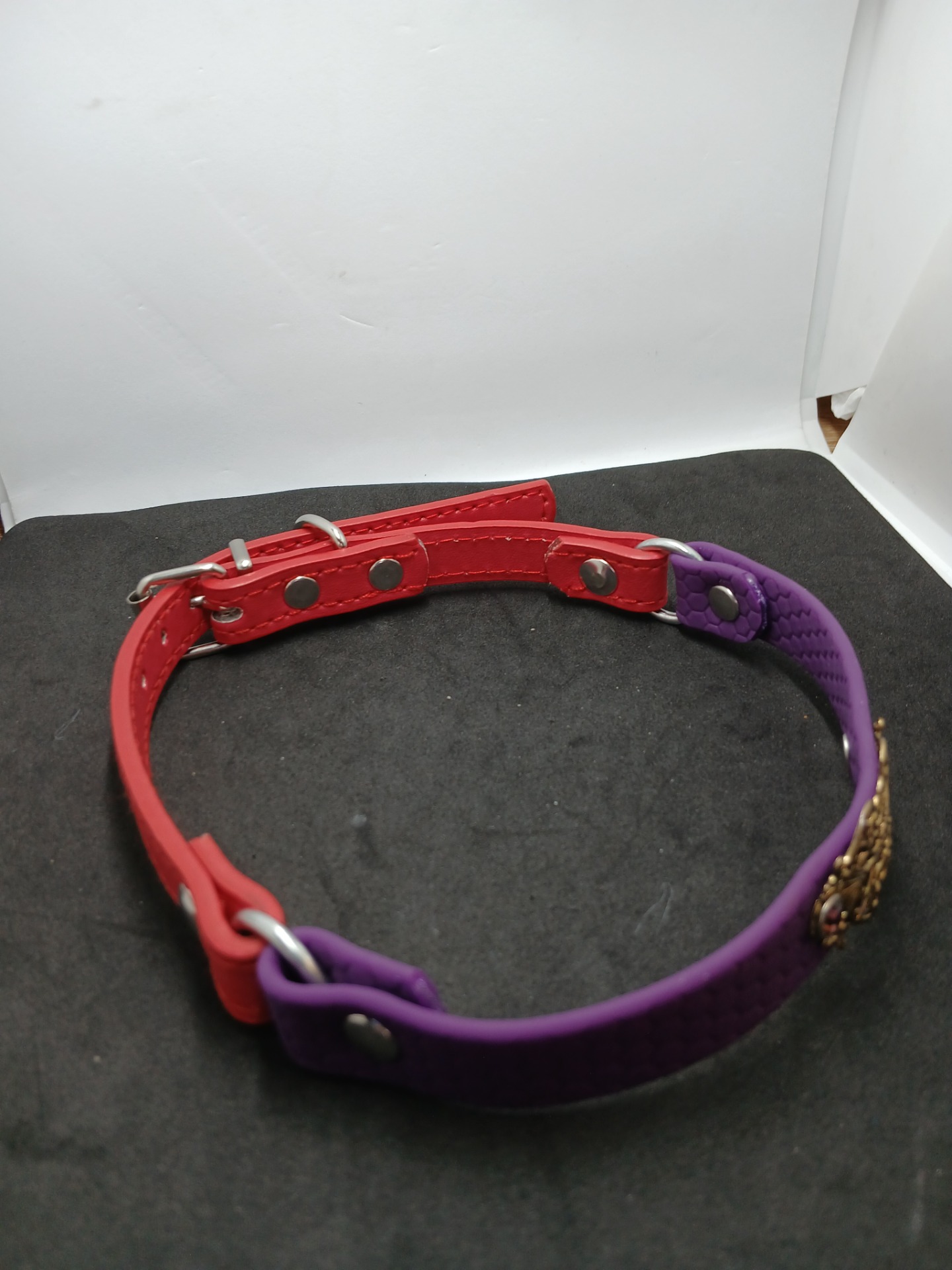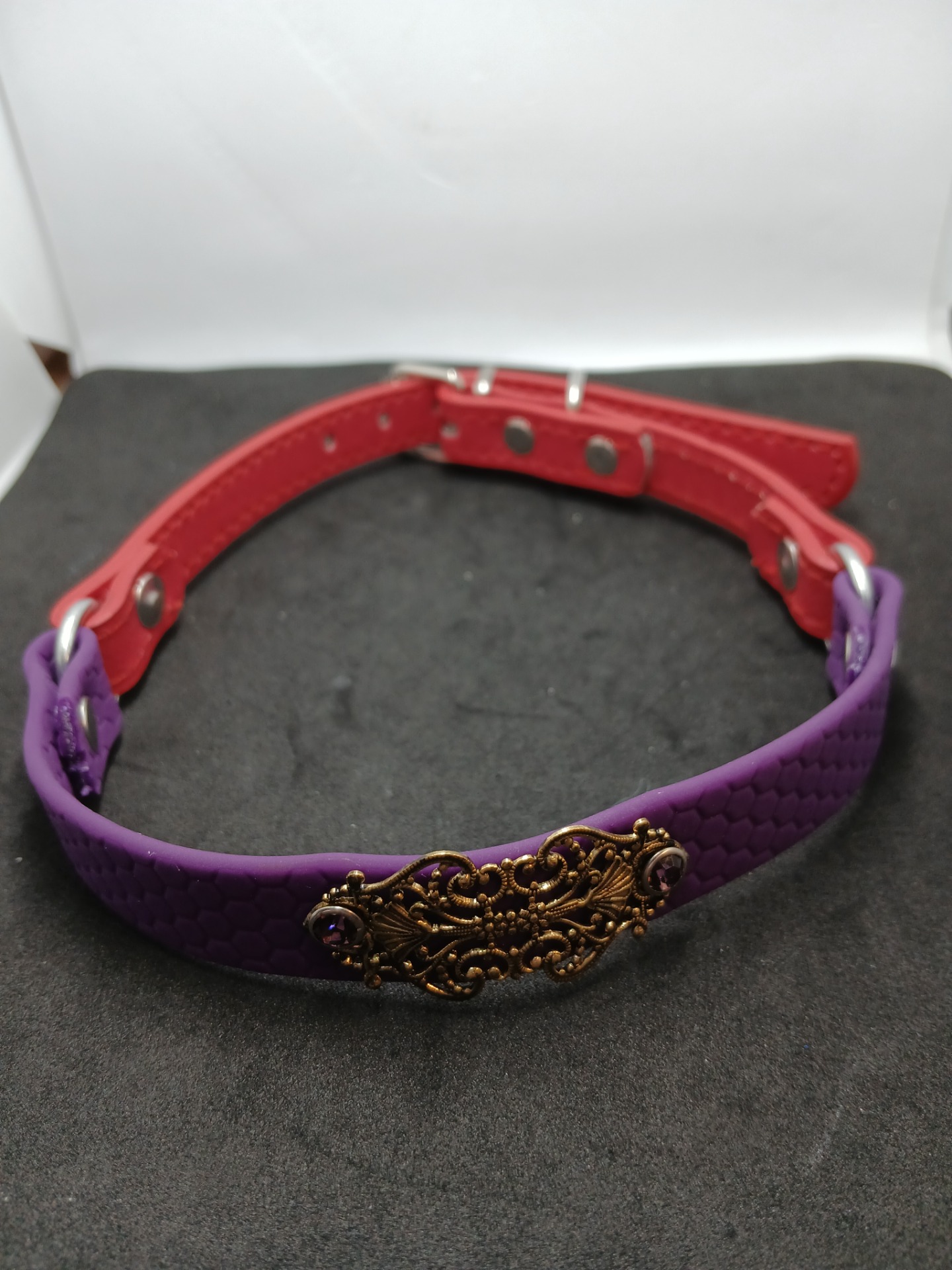 Z voděodolného popruhu Hexa + kůže pohodlný obojek s klasickou kovovou sponou . Obvod obojku 37-43 cm , šířka obojku 16mm. Fialovo červený.