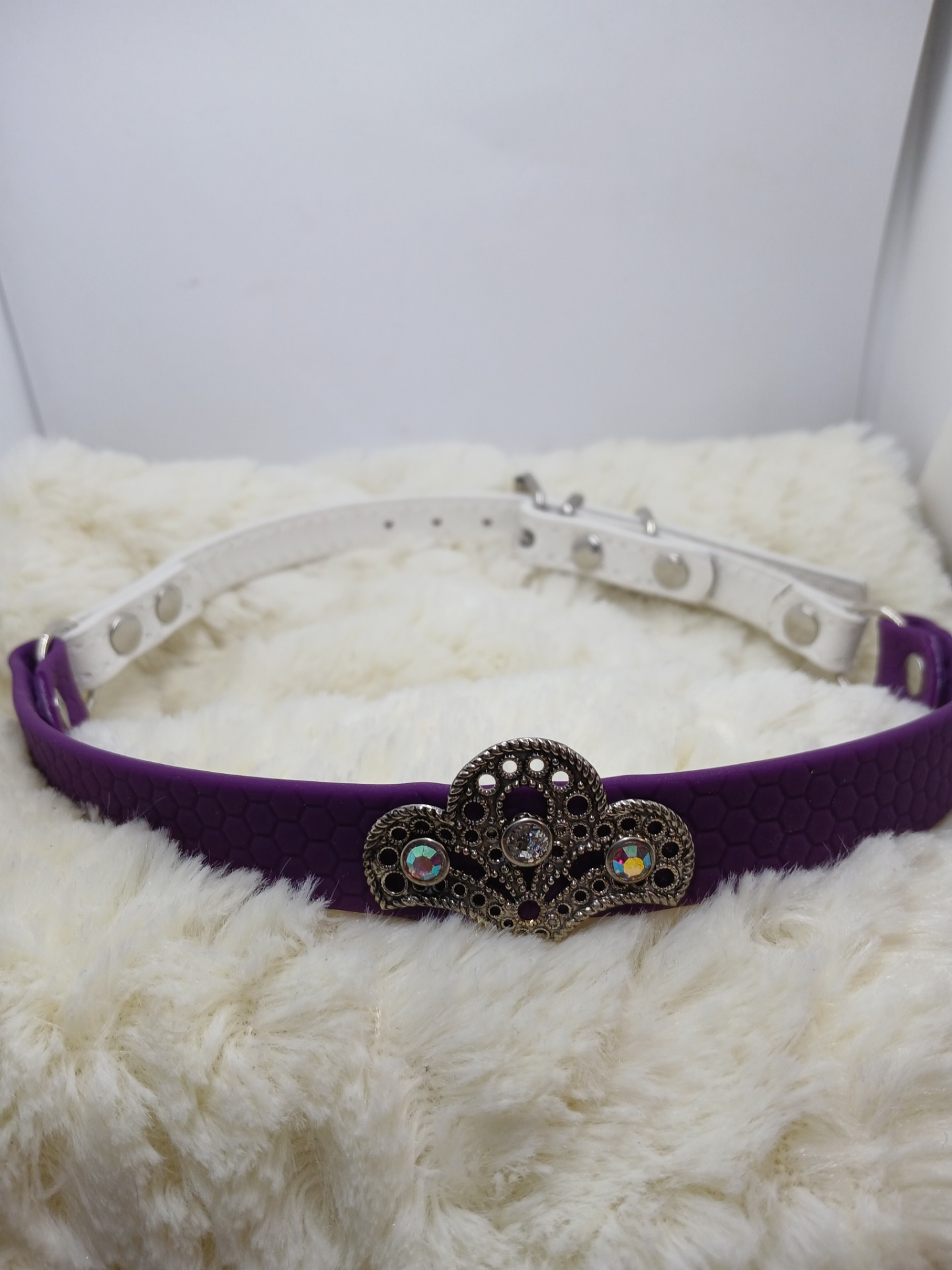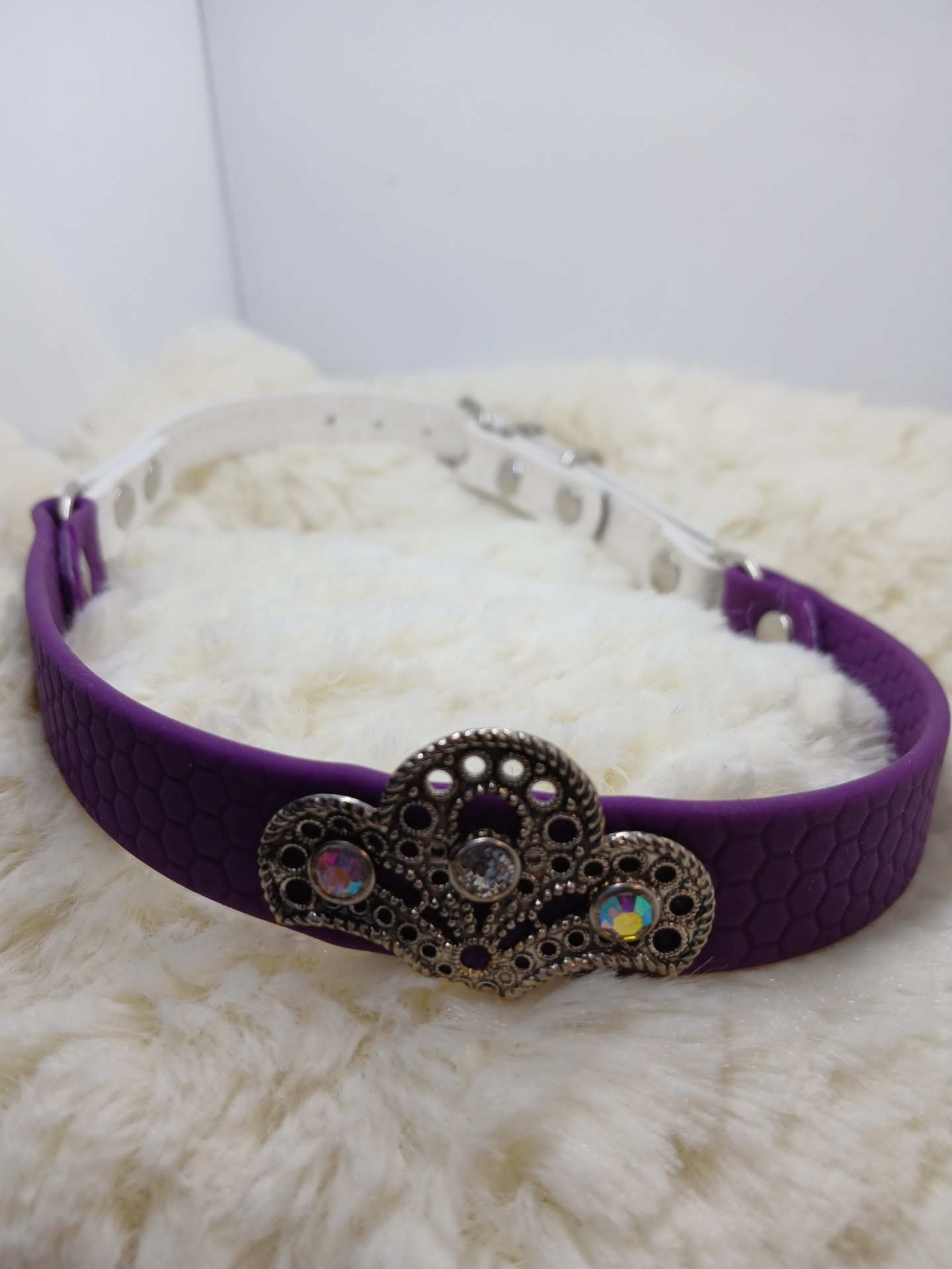 obojek s klasickou kovovou sponou . Obvod obojku 43-49 cm , šířka obojku 16mm. Fialovo bílý.