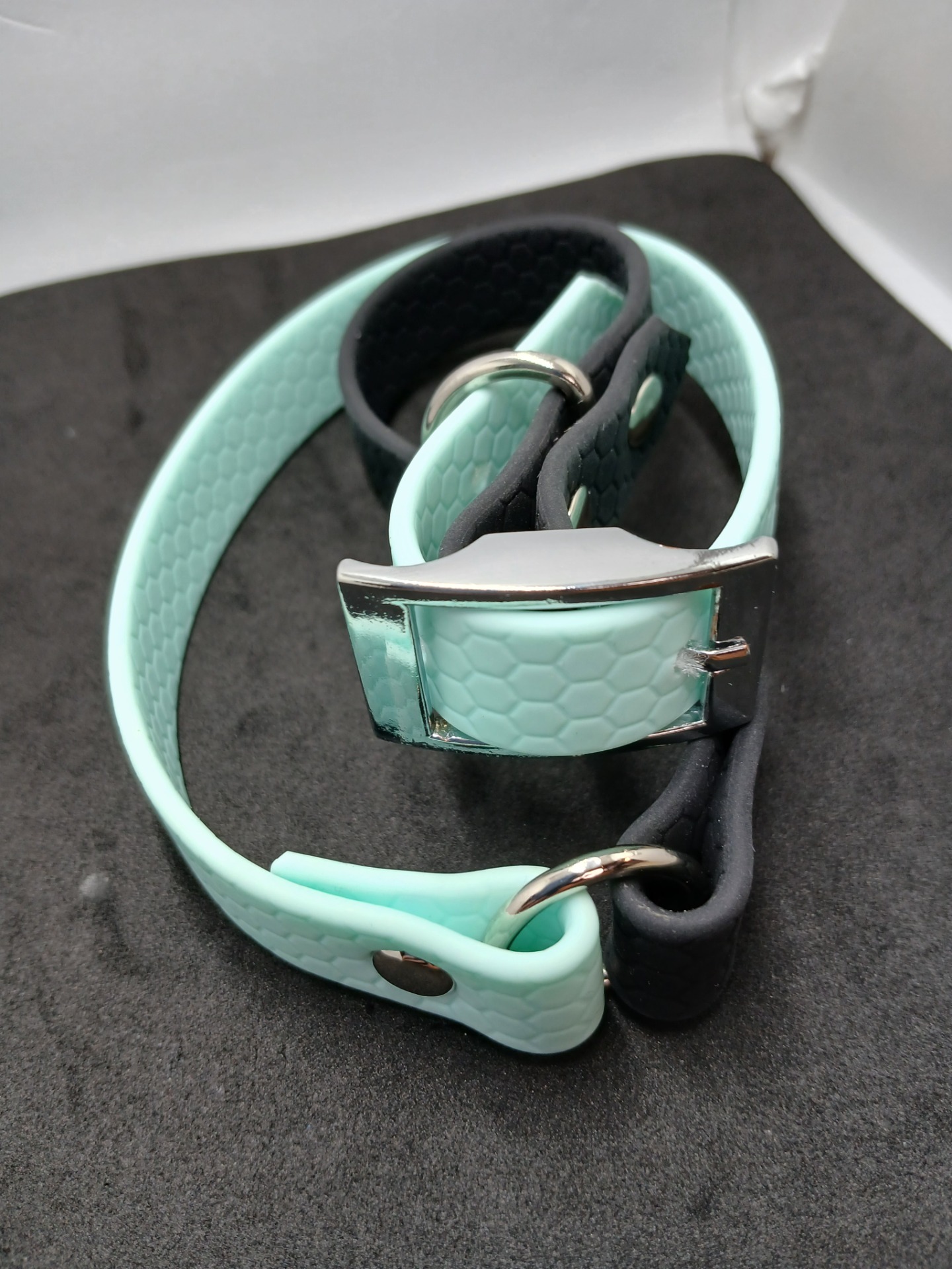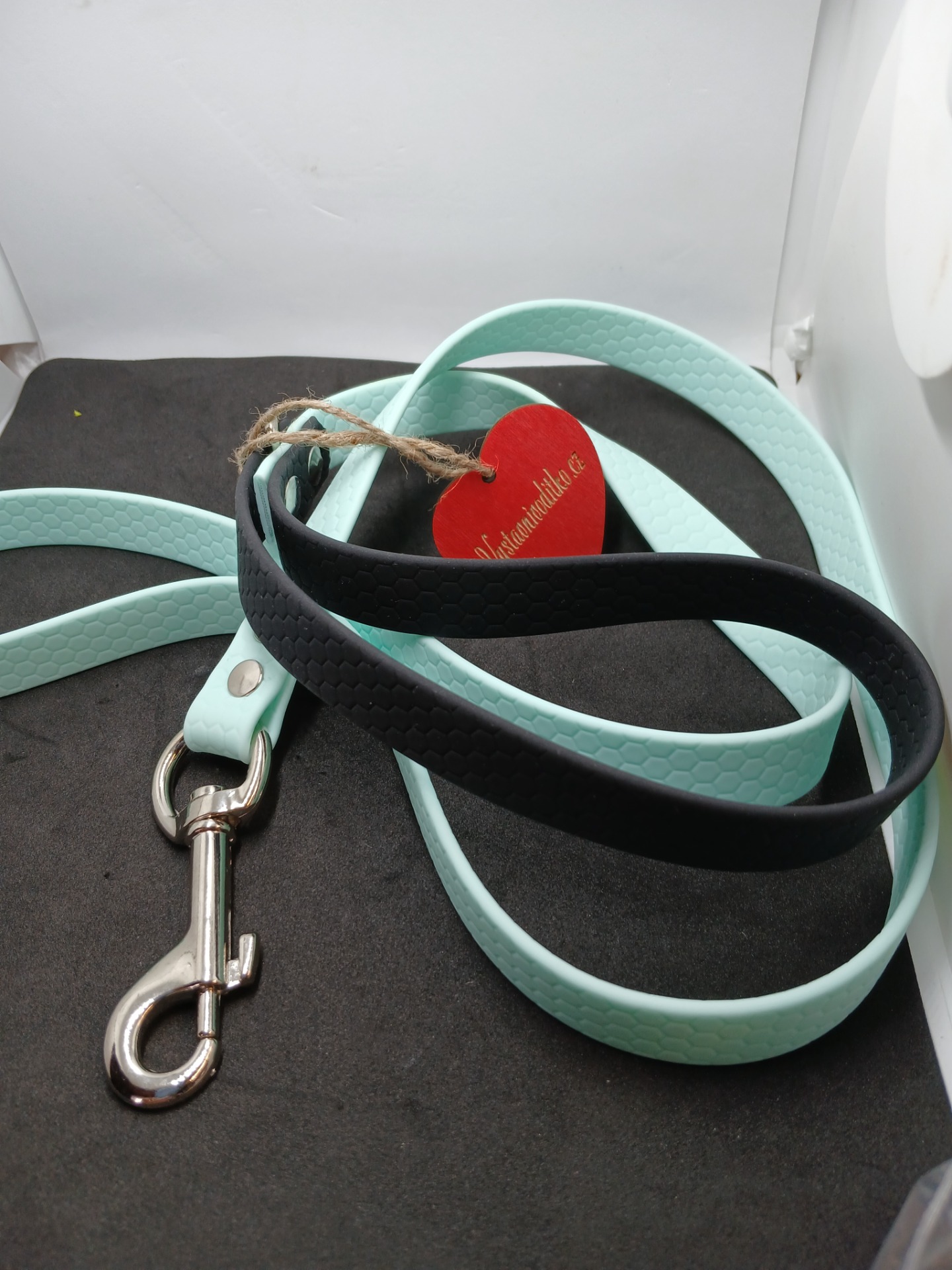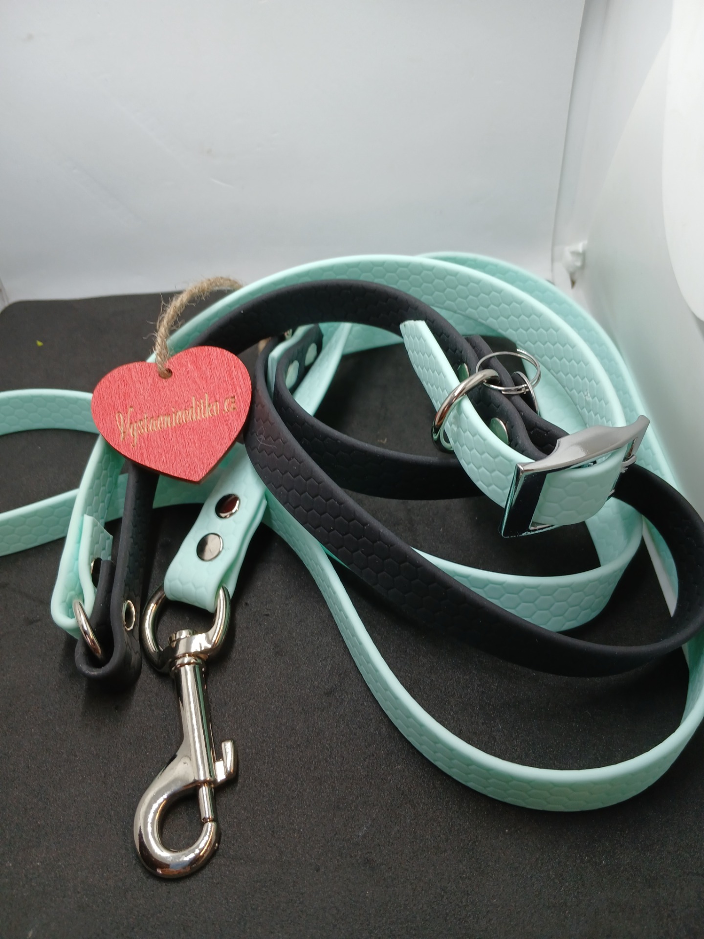Z voděodolného popruhu Hexa pohodlný obojek s klasickou kovovou sponou a vodítko s karabinou . Obvod obojku 47-55 cm , délka vodítka 130 cm , šířka obojku a vodítka 16mm. Mátovězelené a černé .