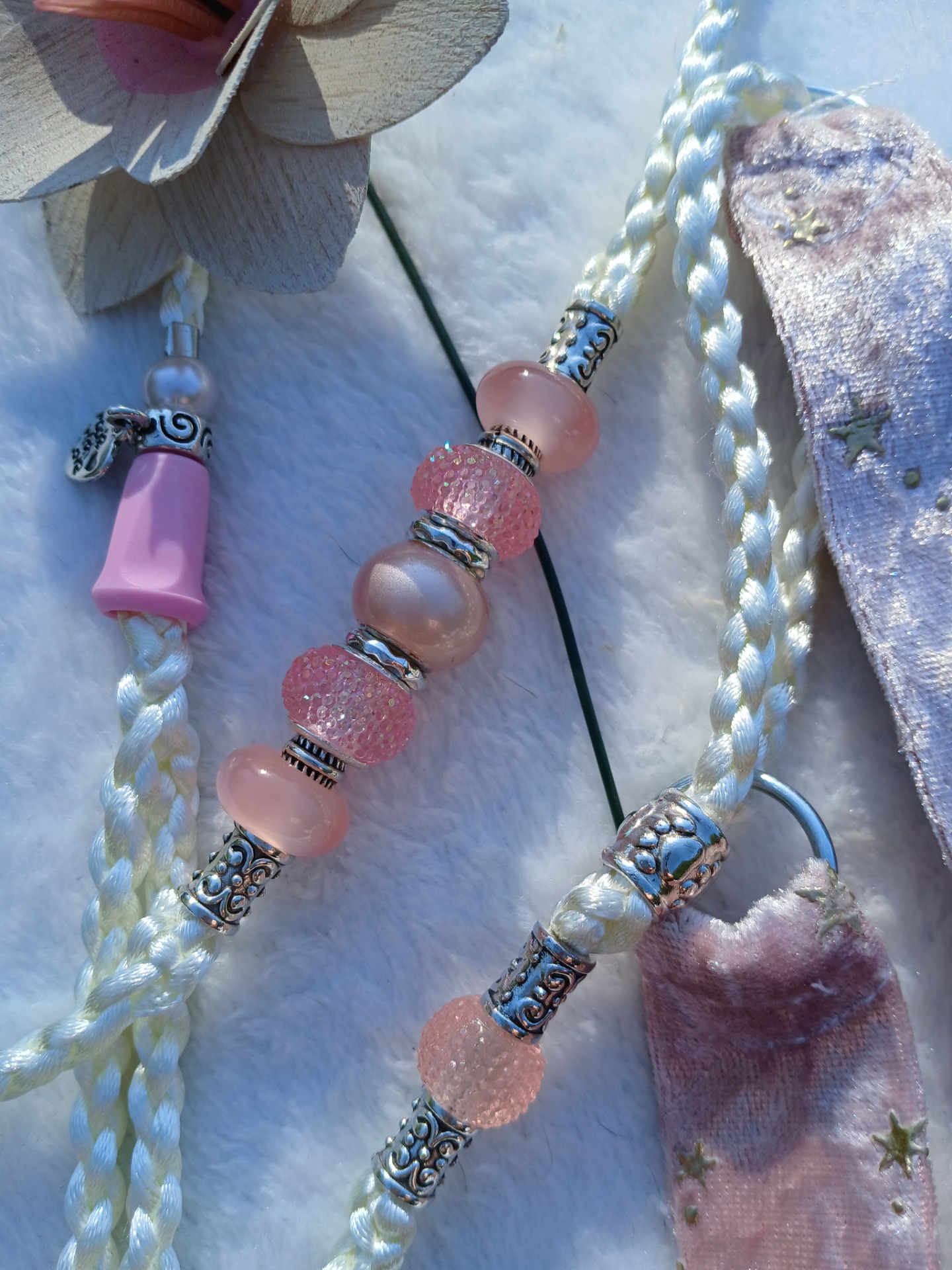 Výstavní vodítko v smetanové barvě zakončené obojkem ze stuhy . Obojek oko-oko 24 cm povolit na 33 cm, zdobené korálky.