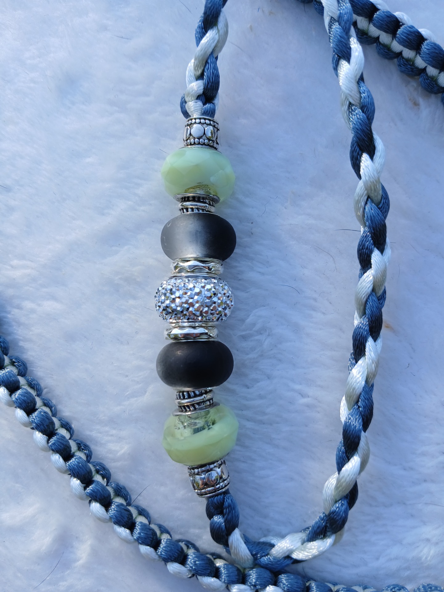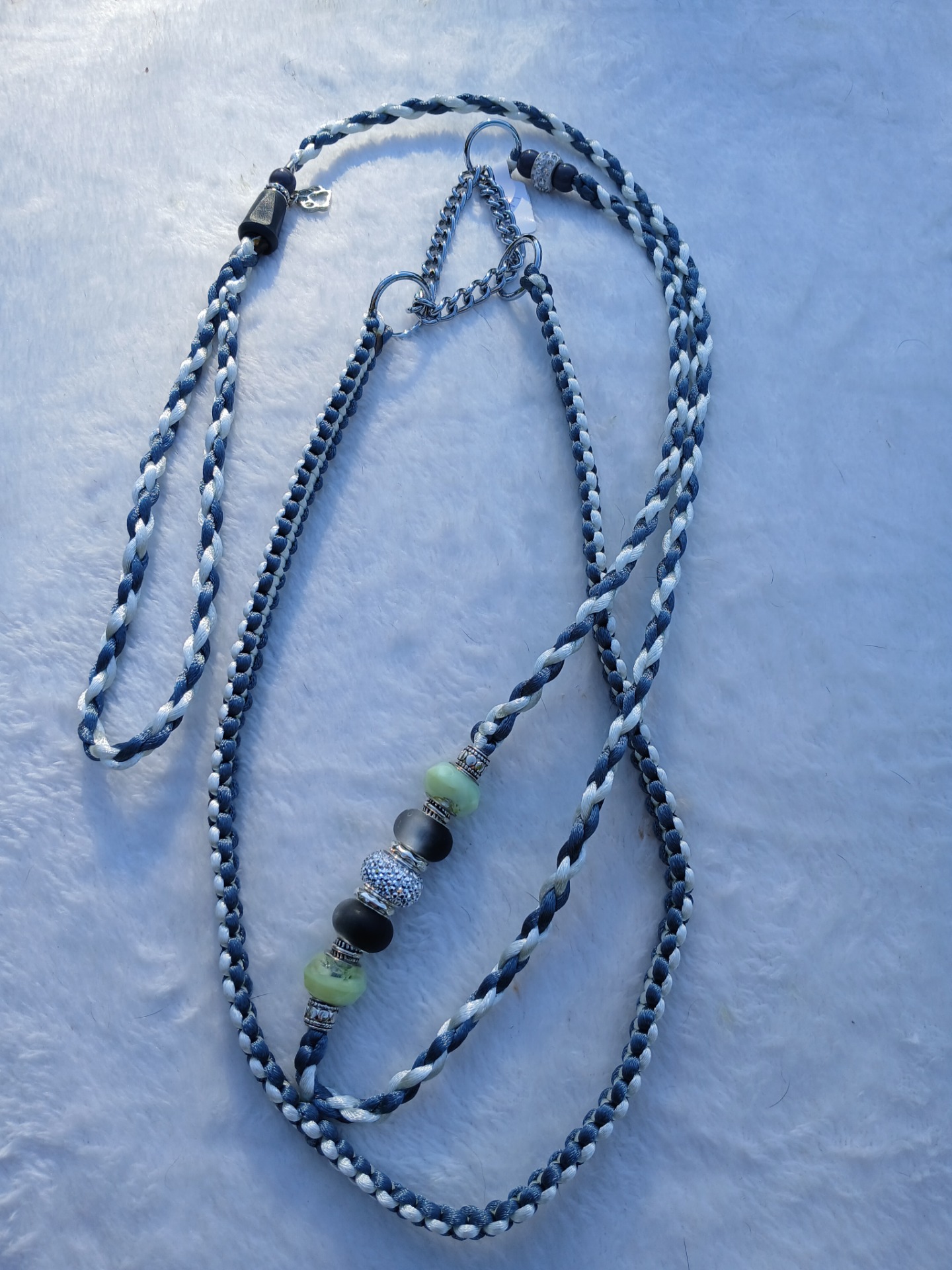 Výstavní vodítko v šedo bílé barvě zakončené obojkem . Obojek oko-oko 49 cm povolit na 56 cm, zdobené korálky.