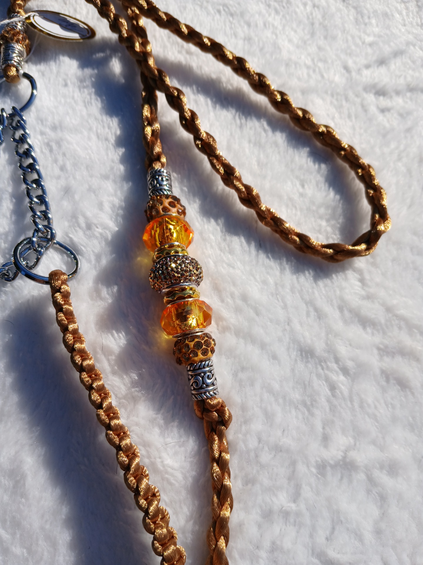 Výstavní vodítko v hnědo zlaté barvě zakončené obojkem . Obojek oko-oko 38 cm povolit na 46 cm, zdobené korálky.