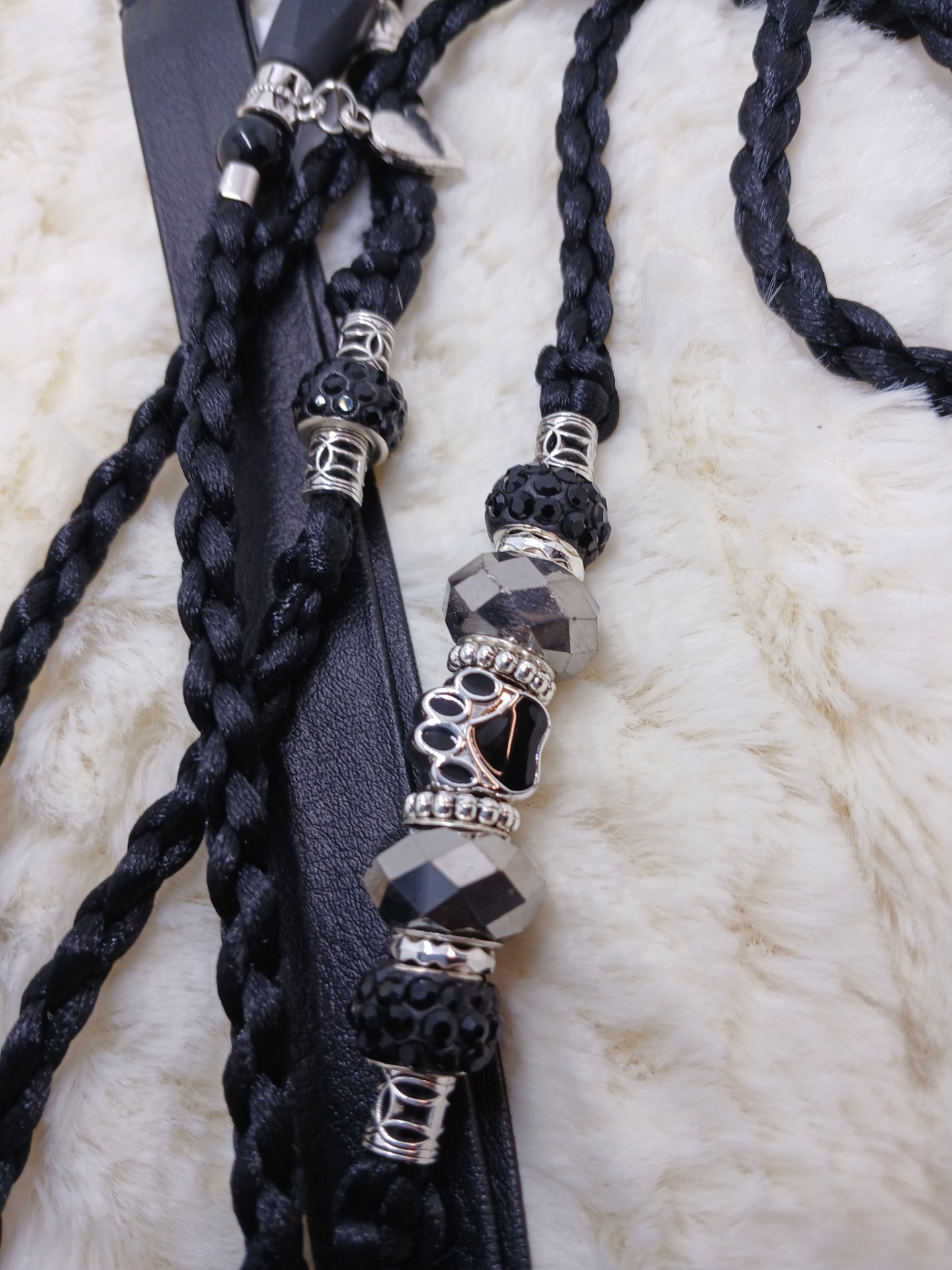 Výstavní vodítko v černé barvě zakončené obojkem z umělé kůže. Obojek oko-oko 45 cm povolit na 56 cm, zdobené korálky.