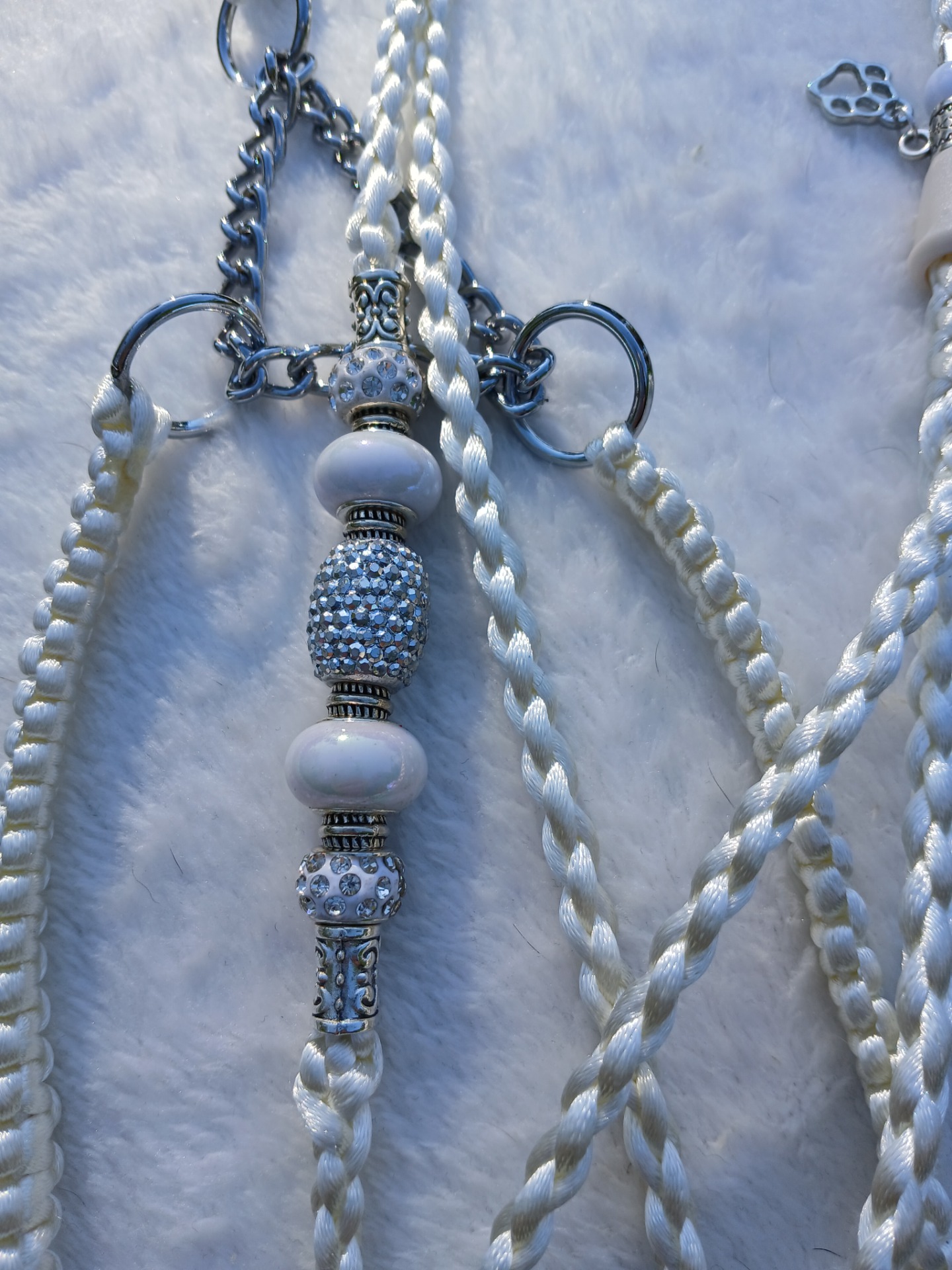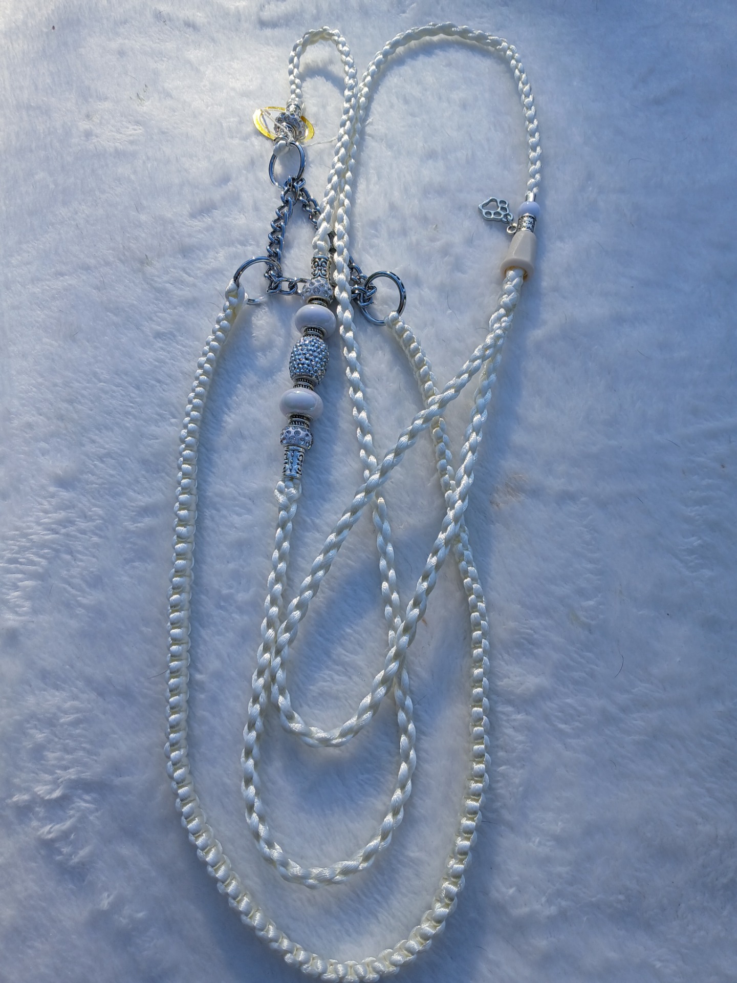 Výstavní vodítko v bílé barvě zakončené obojkem . Obojek oko-oko 43 cm povolit na 52 cm, zdobené korálky.