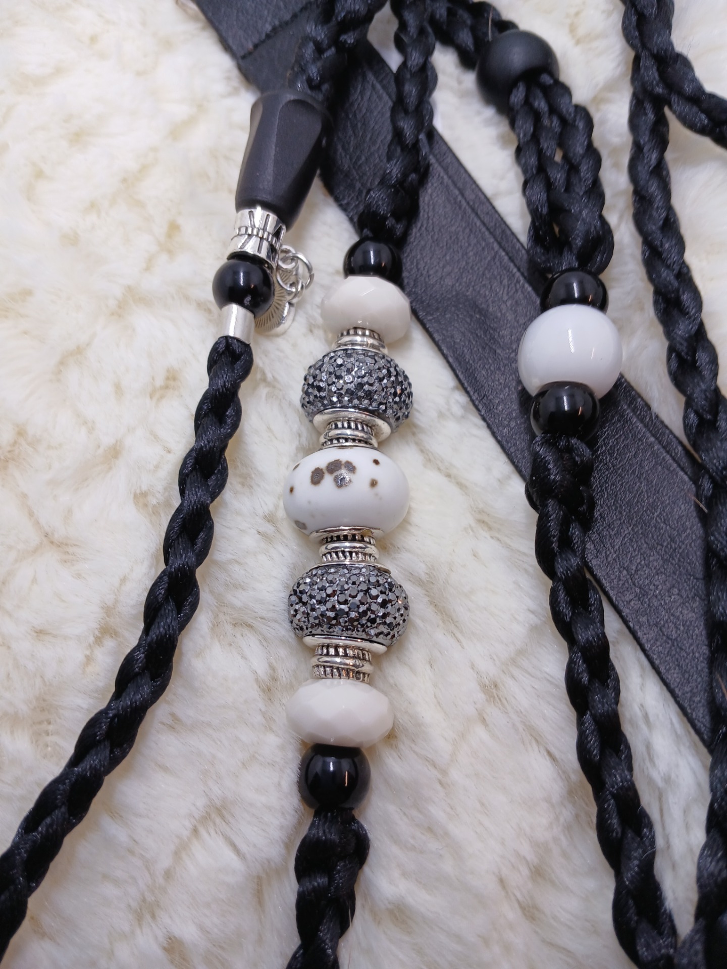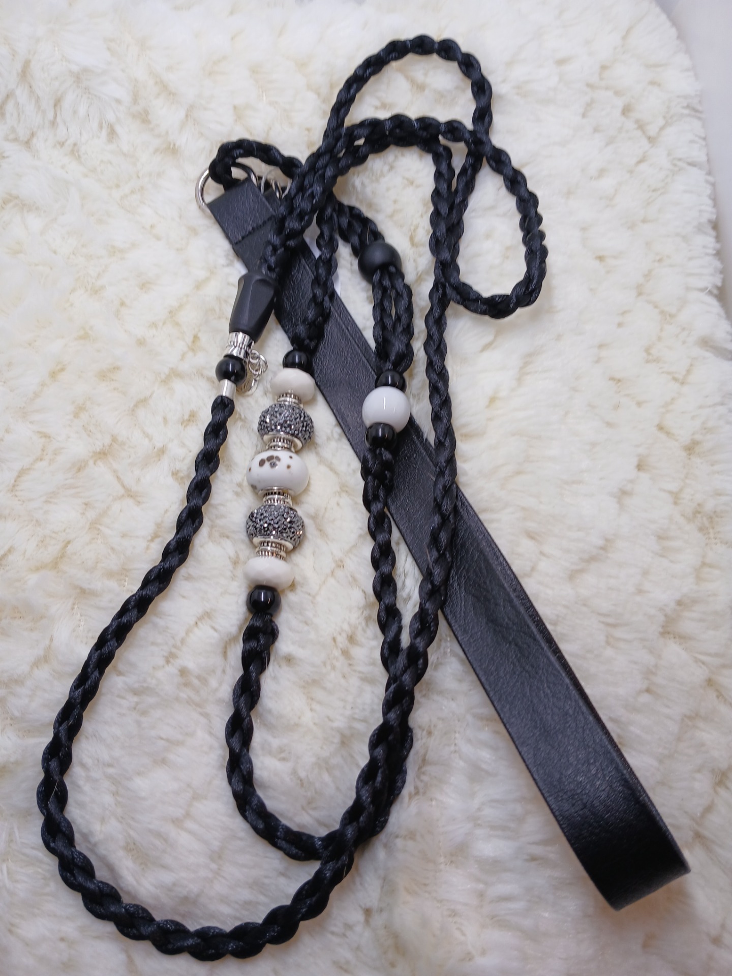 Výstavní vodítko v černé barvě zakončené obojkem z umělé kůže. Obojek oko-oko 40 cm povolit na 50cm, zdobené korálky.