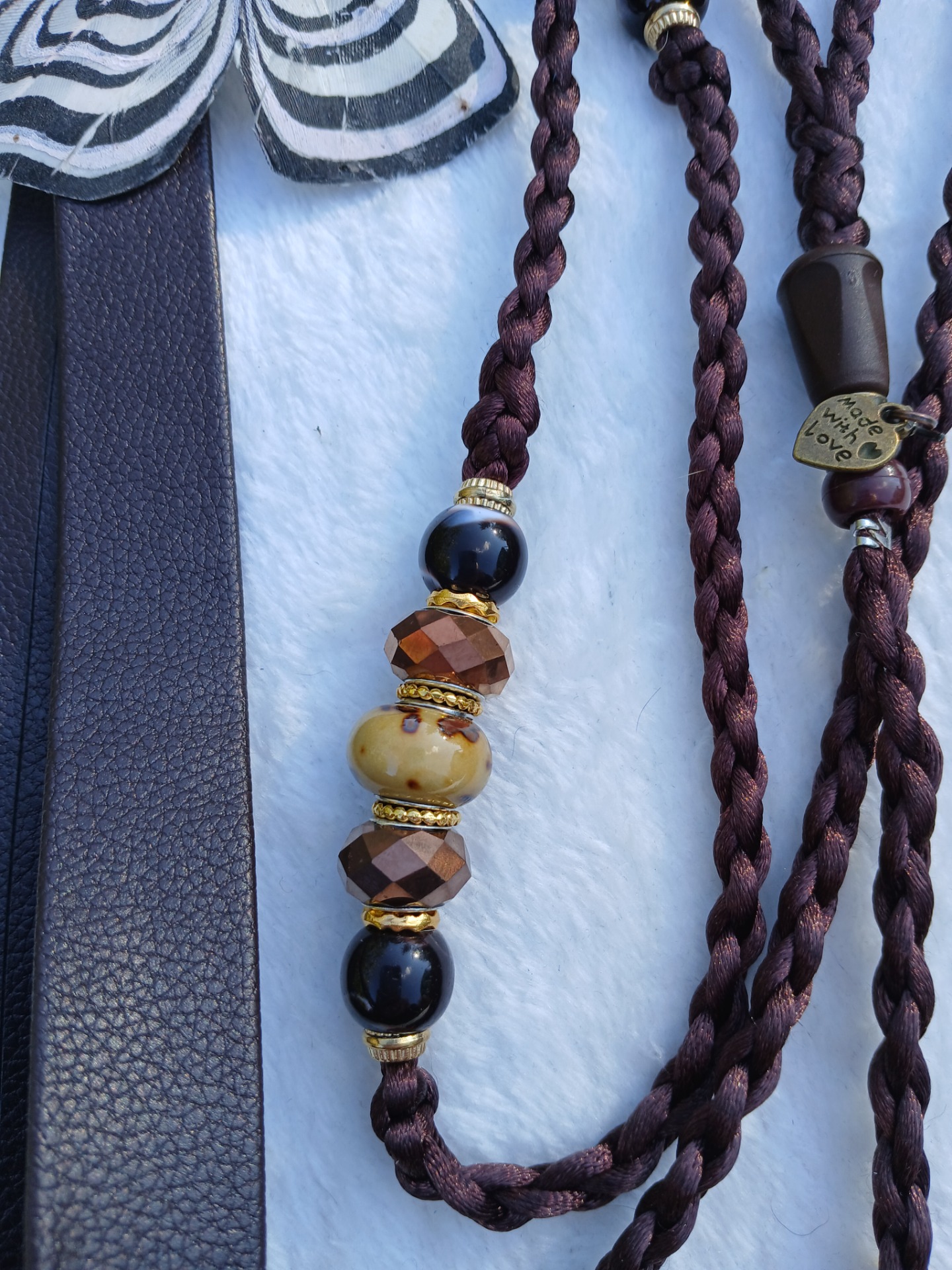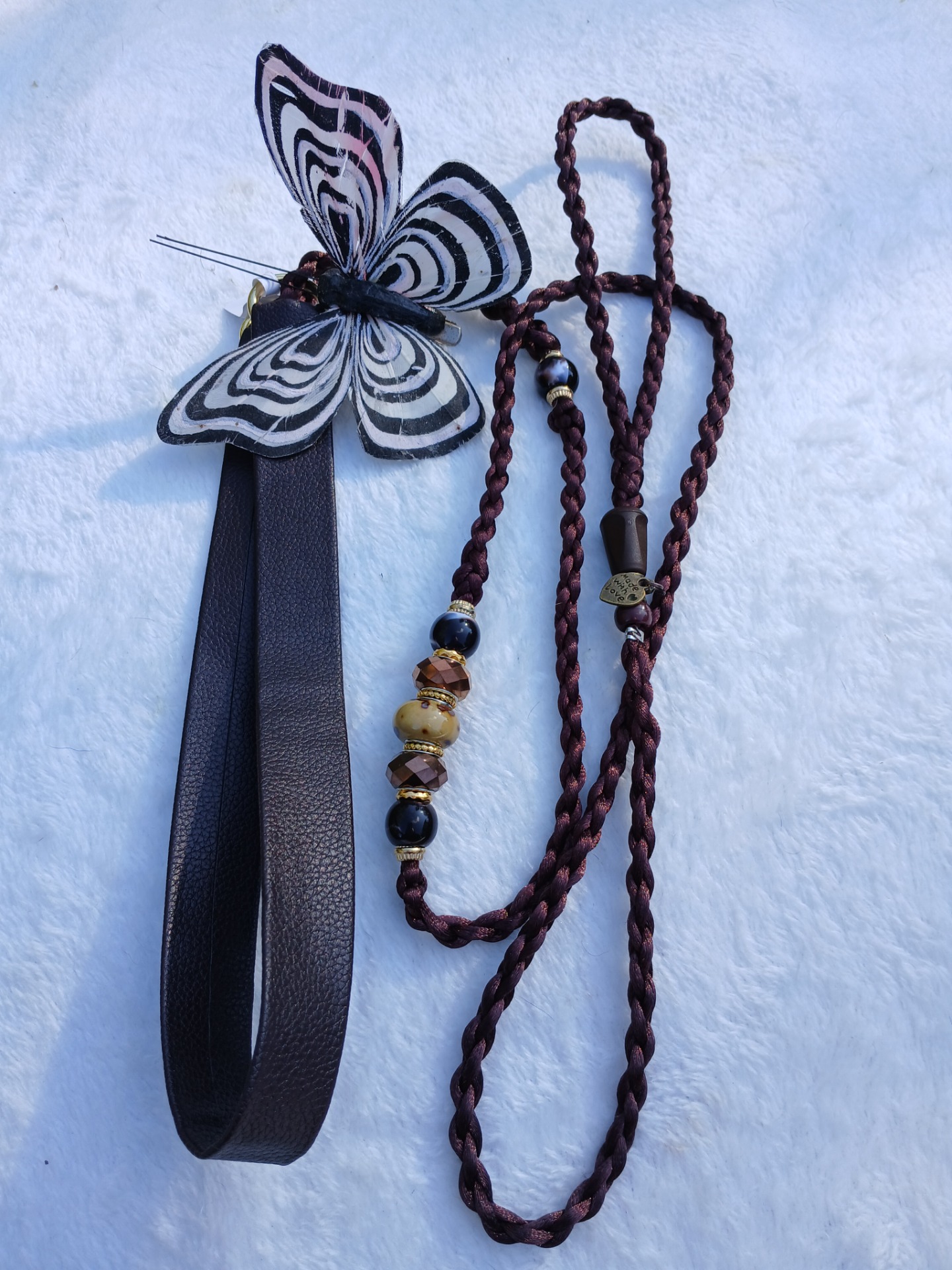 Výstavní vodítko v hnědé barvě zakončené obojkem z umělé kůže. Obojek oko-oko 41 cm povolit na 50 cm, zdobené korálky.