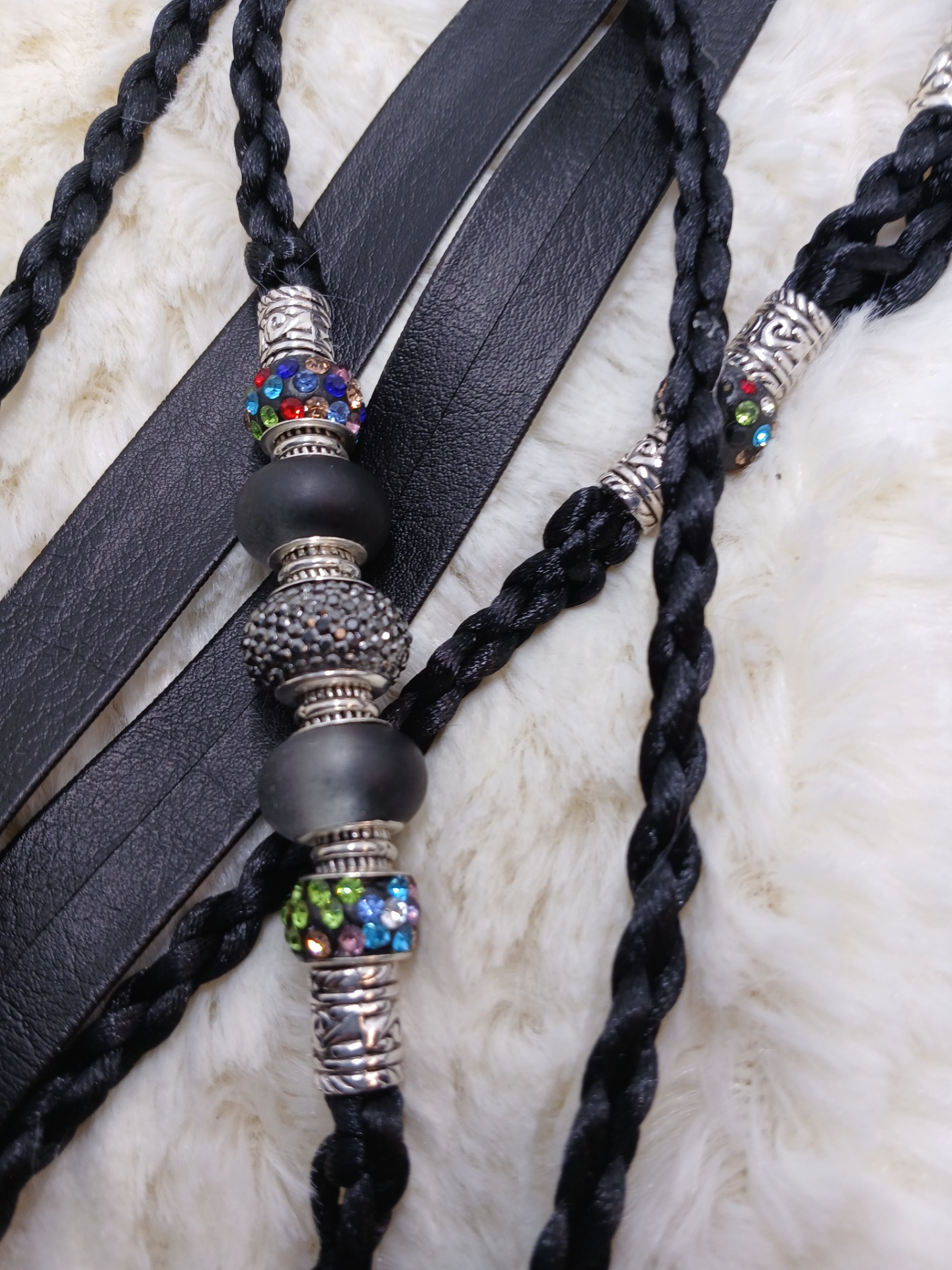 Výstavní vodítko v černé barvě zakončené obojkem z umělé kůže. Obojek oko-oko 45 cm povolit na 55 cm, zdobené korálky.
