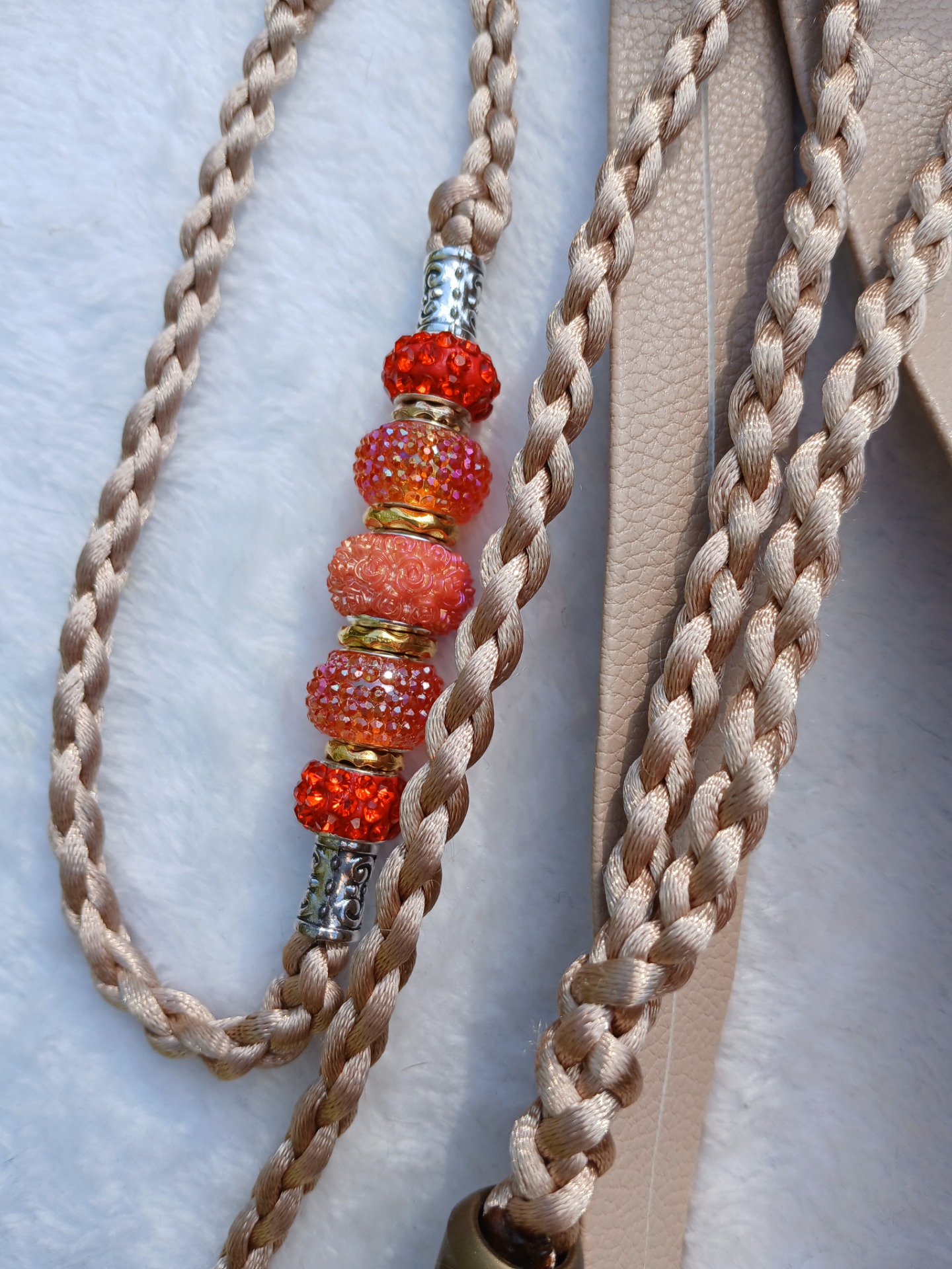 Výstavní vodítko v béžové barvě zakončené obojkem z umělé kůže. Obojek oko-oko 48 cm povolit na 55 cm, zdobené korálky.