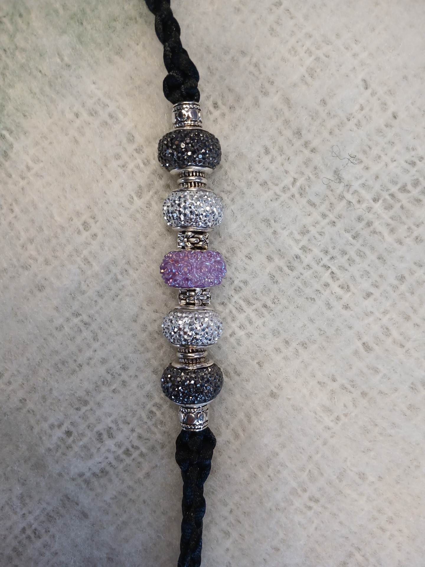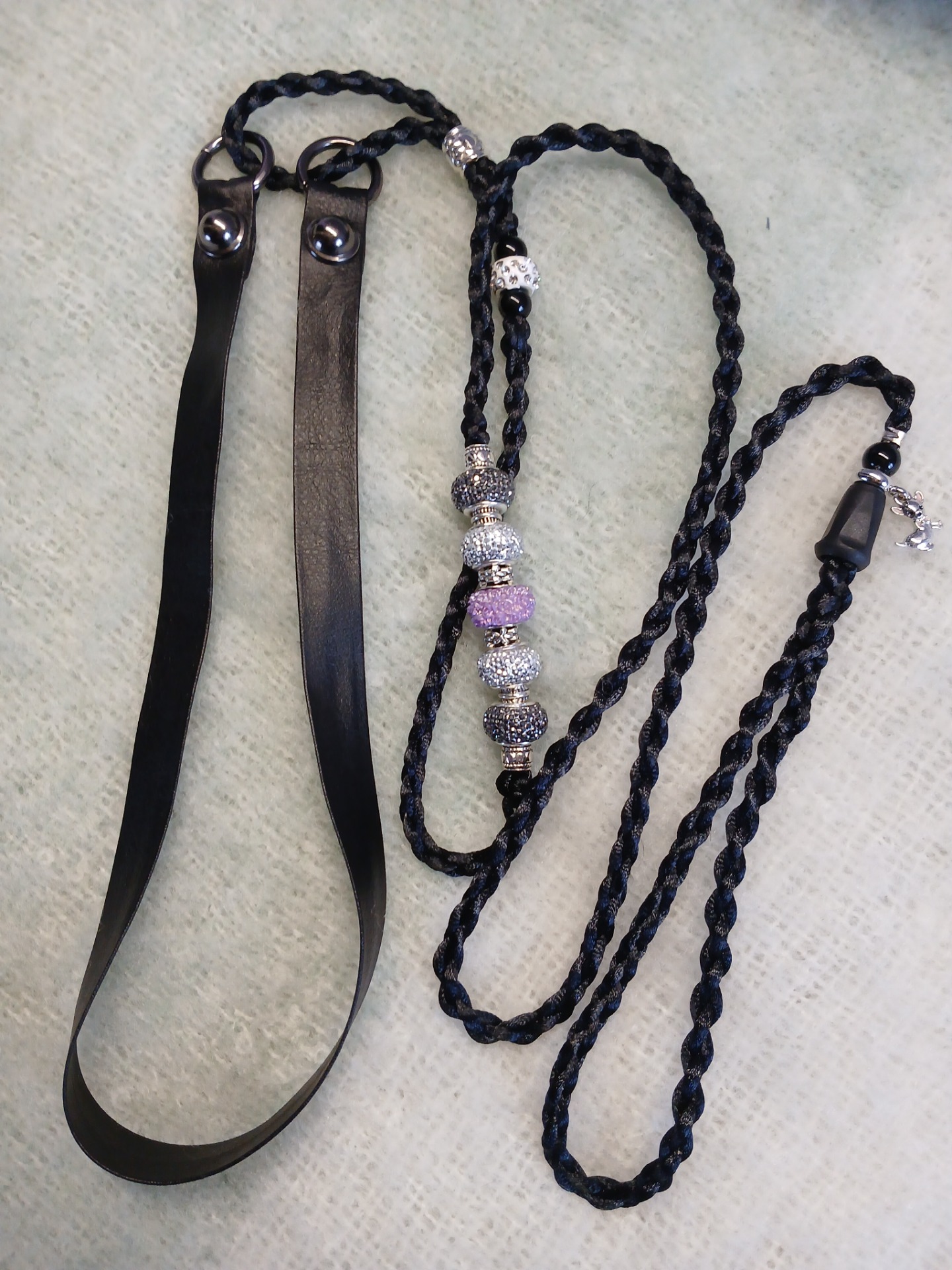 Výstavní vodítko v černé barvě zakončené obojkem z umělé kůže. Obojek oko-oko 48 cm povolit na 55 cm, zdobené korálky.