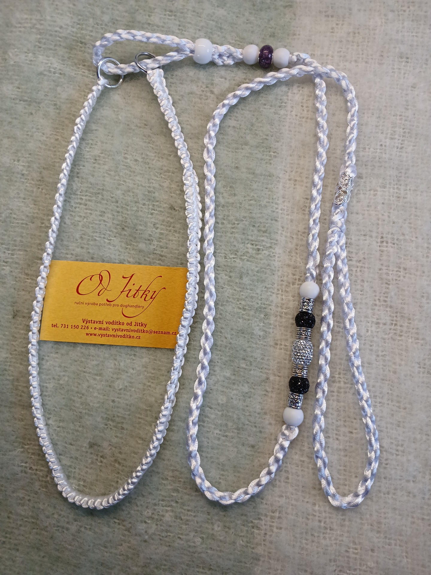 Výstavní vodítko v bílé barvě zakončené obojkem . Síla vodítka cca 7 mm . Obojek oko-oko 57 cm povolit na 64 cm, zdobené korálky.