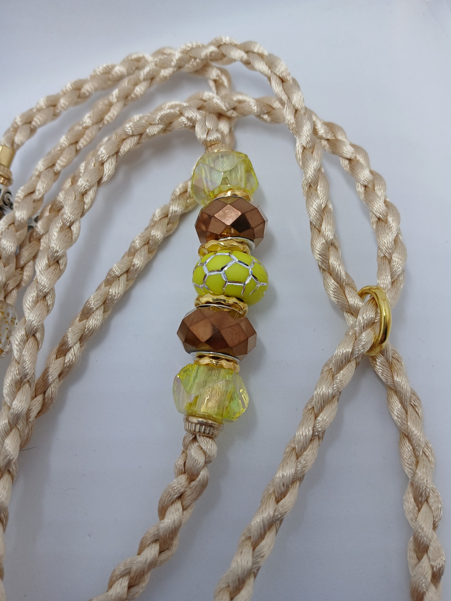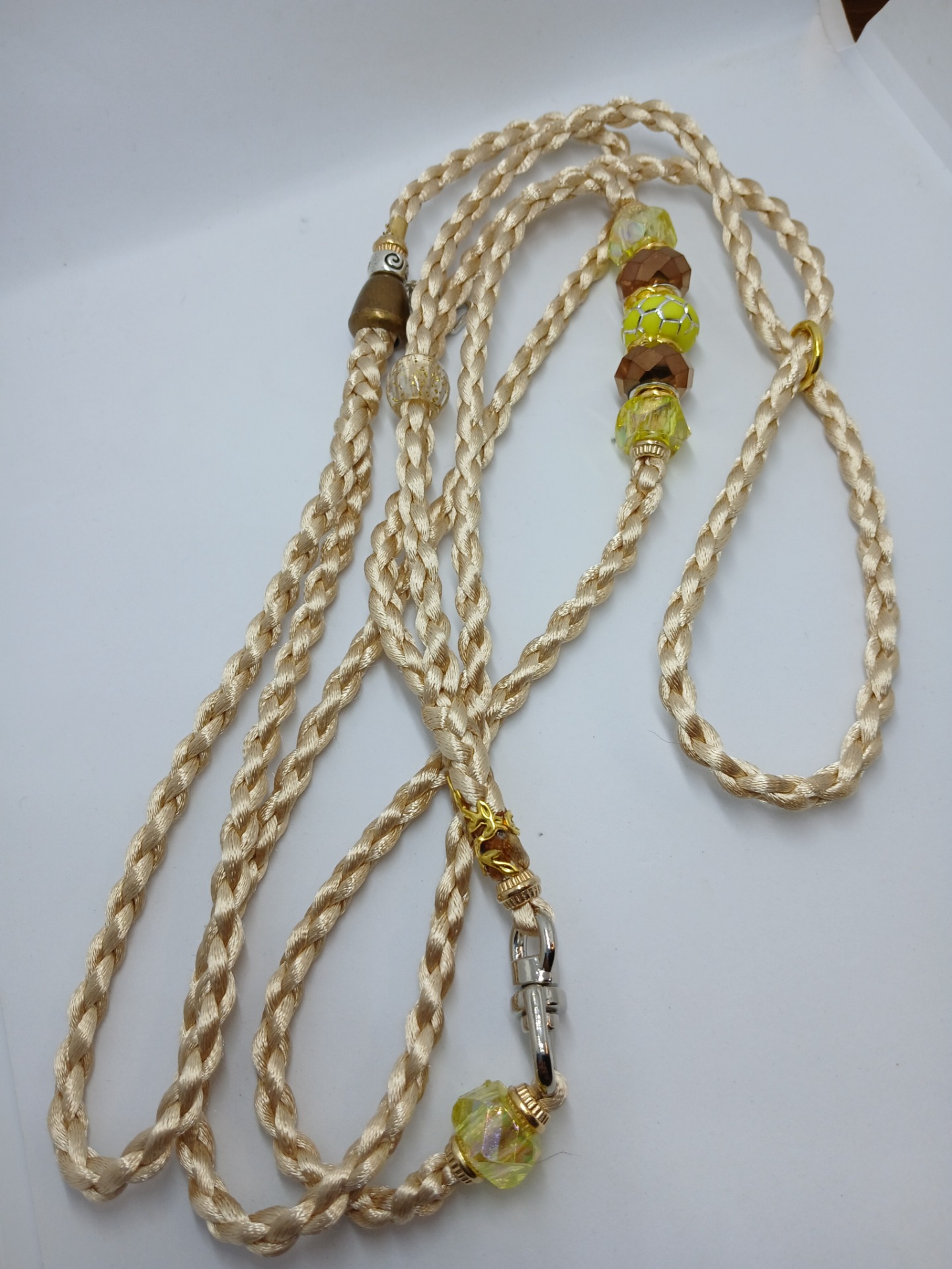 Výstavní vodítko v béžové barvě zakončené na smyčku, zdobené korálky.