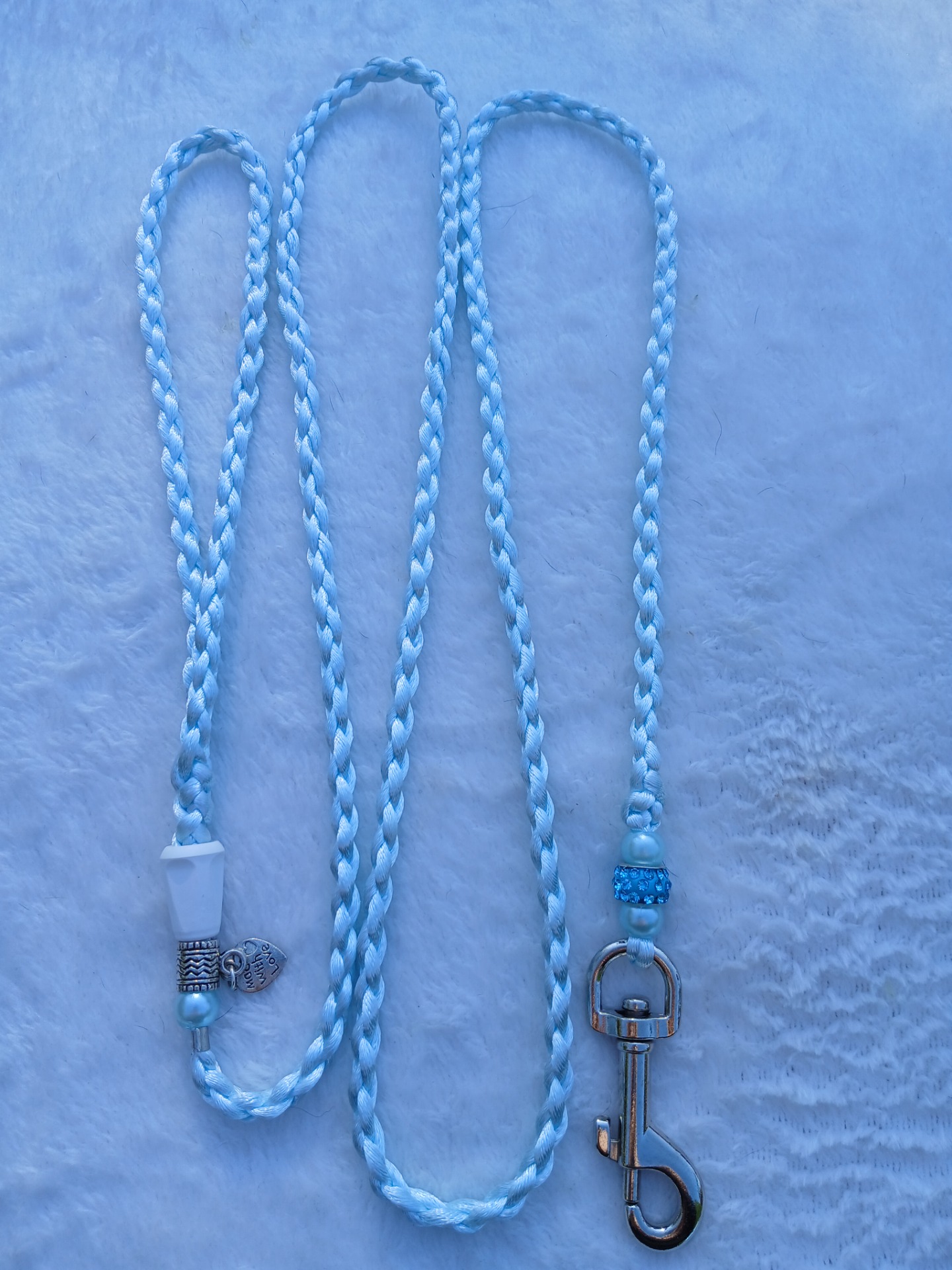 Výstavní vodítko v sv.modré barvě zakončené na karabinu, bez zdobení korálky.