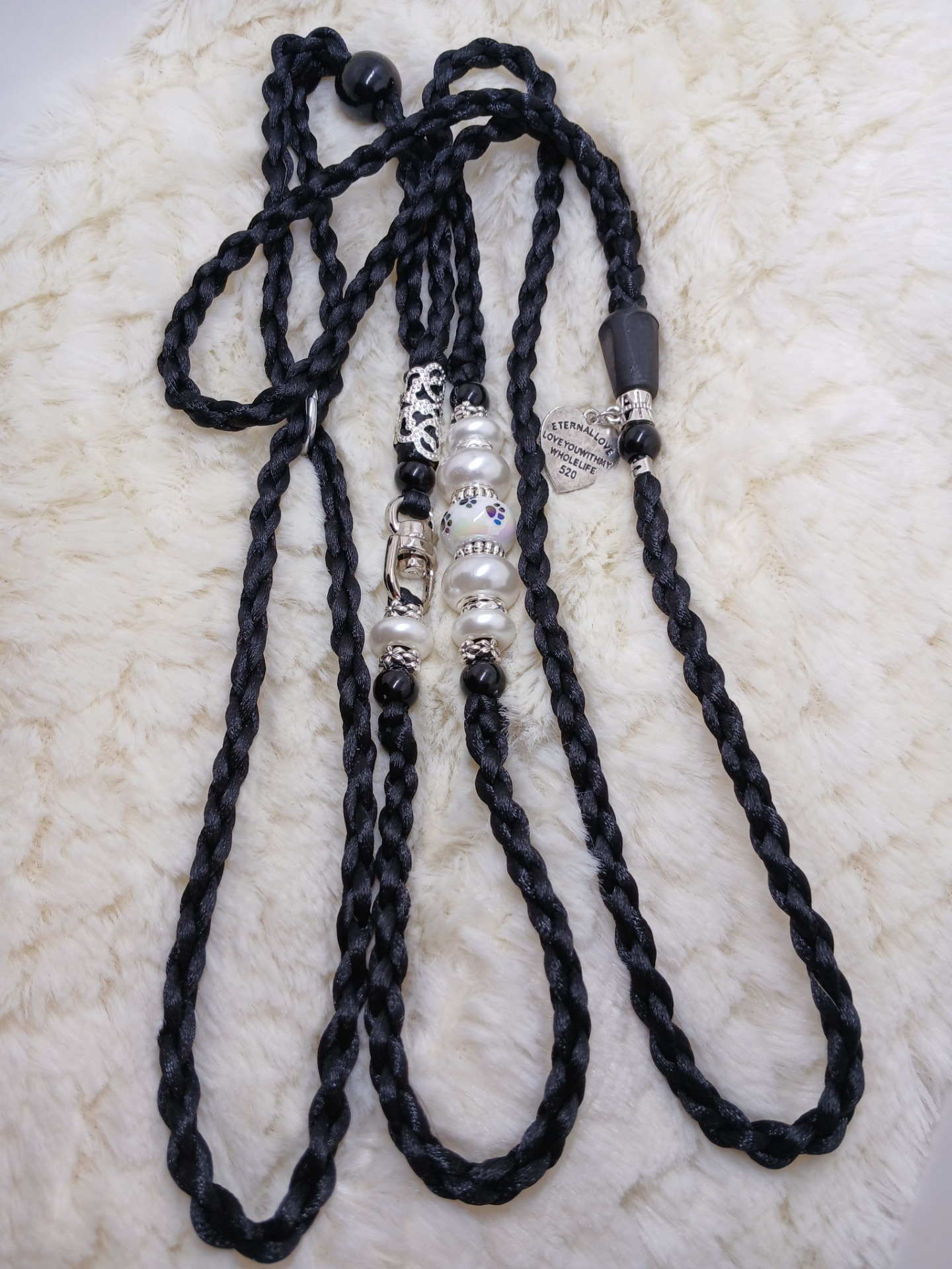 Výstavní vodítko v černé barvě zakončené na smyčku, zdobené korálky.