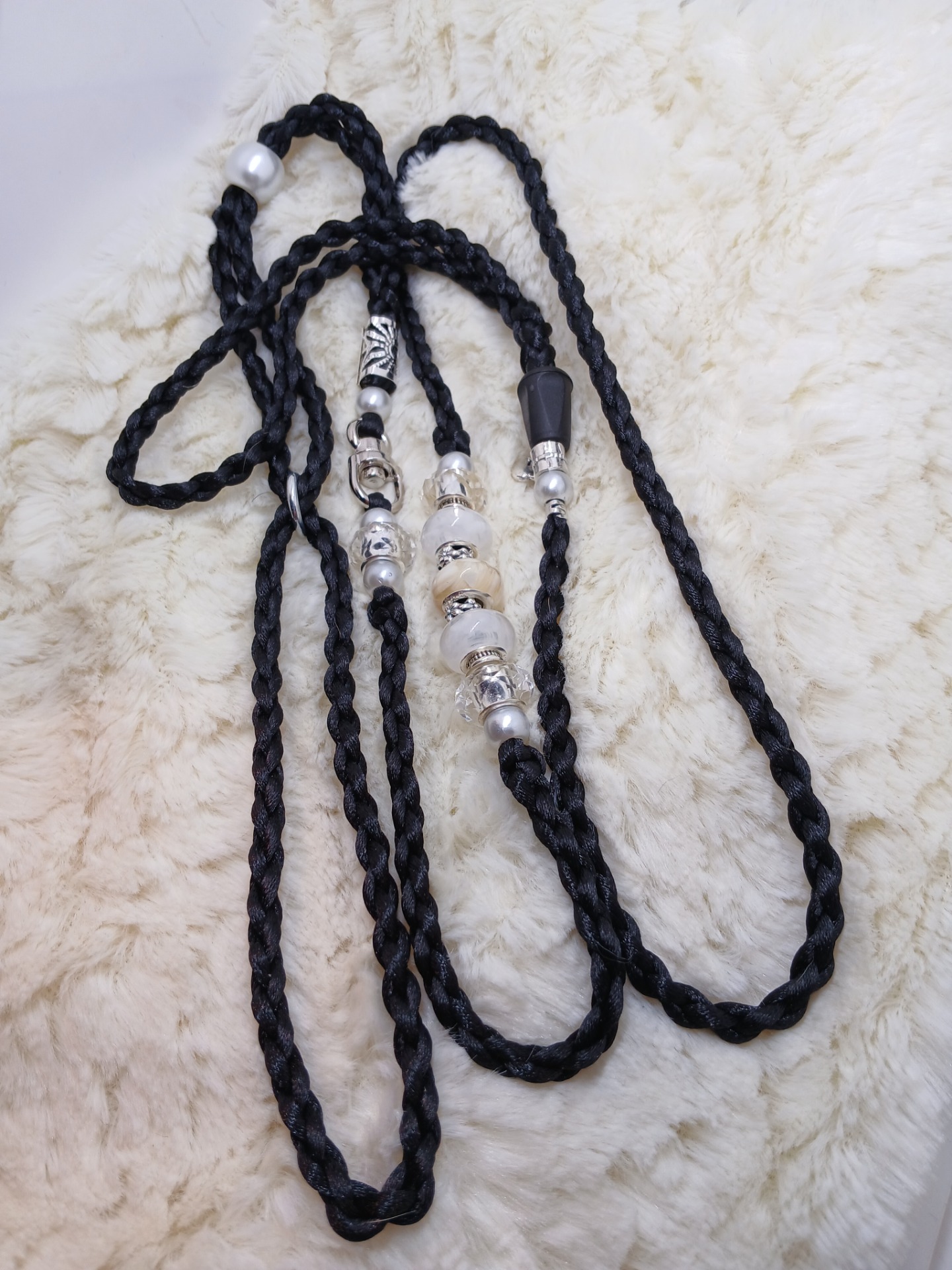 Výstavní vodítko v černé barvě zakončené na smyčku, zdobené korálky.