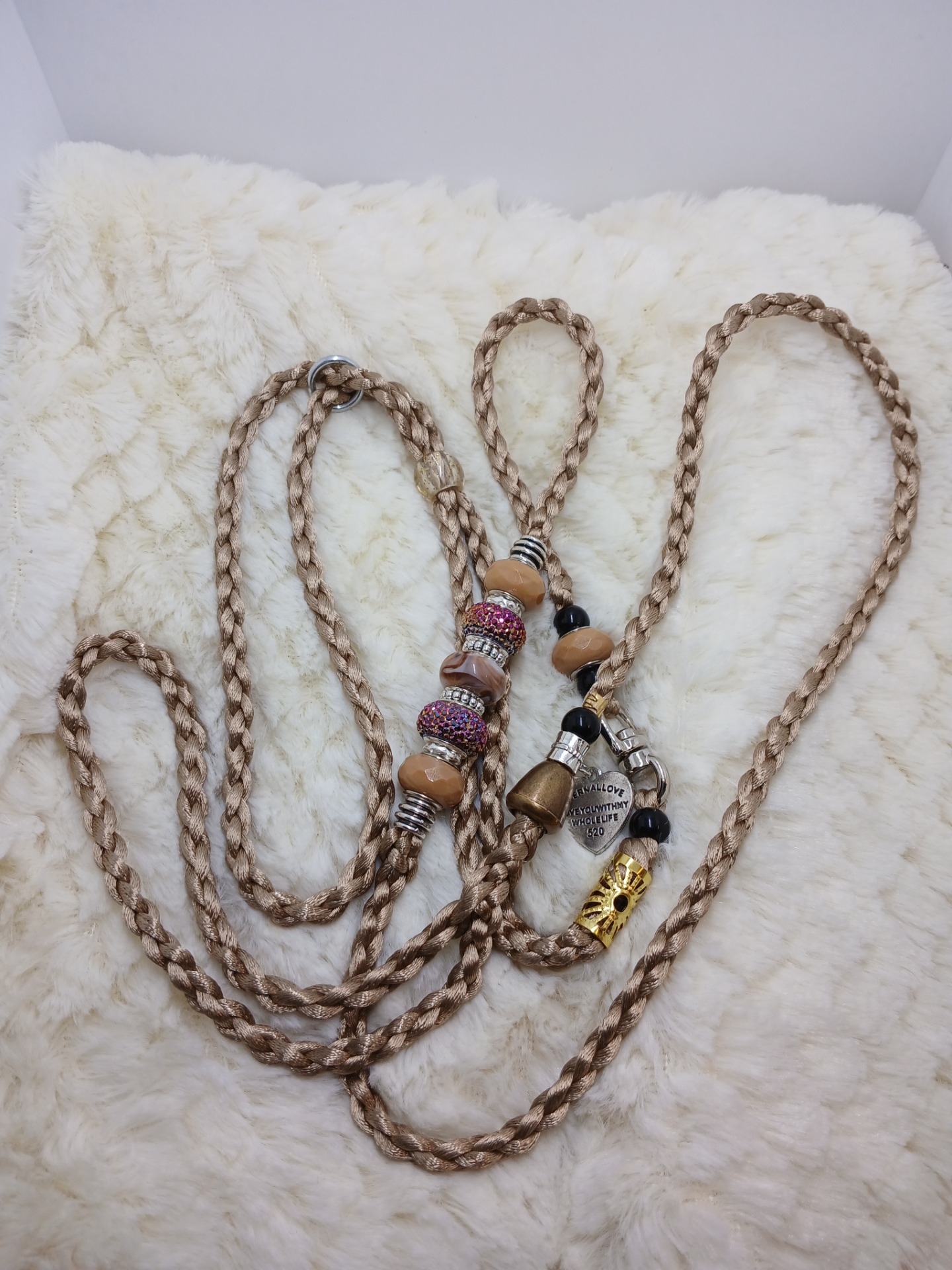 Výstavní vodítko v zlatobéžové barvě zakončené na smyčku, zdobené korálky.