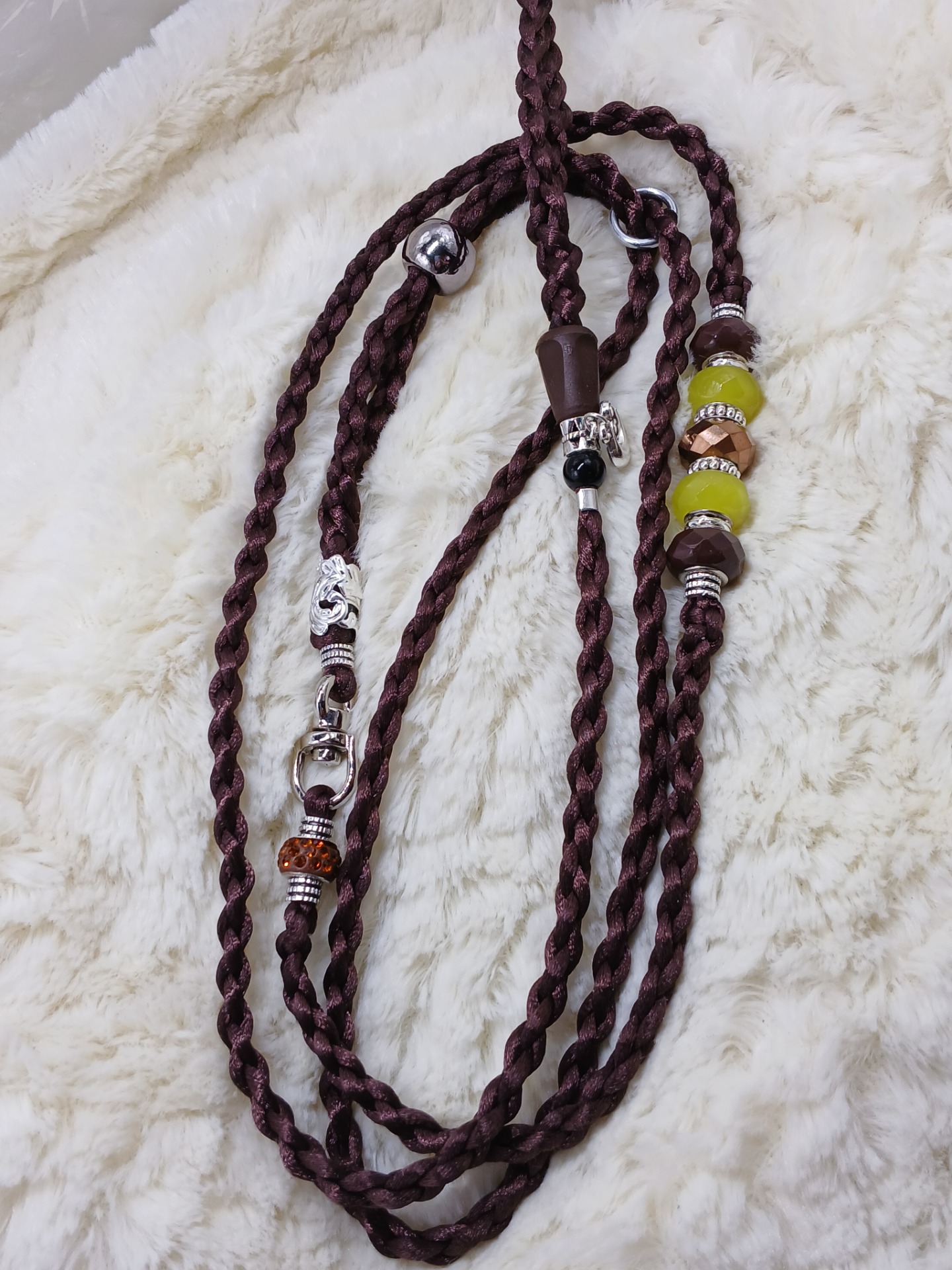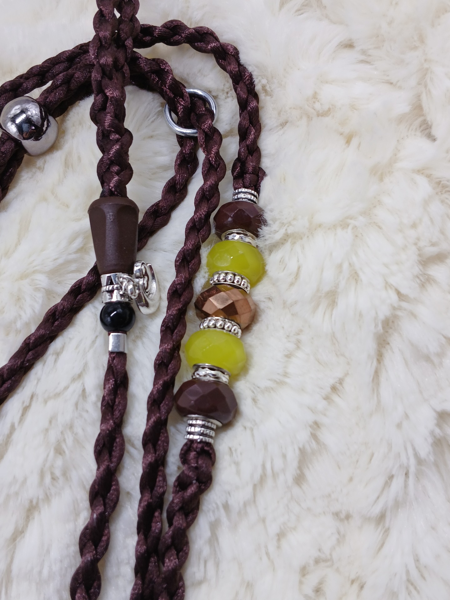 Výstavní vodítko v hnědé barvě zakončené smyčkou, zdobené korálky.