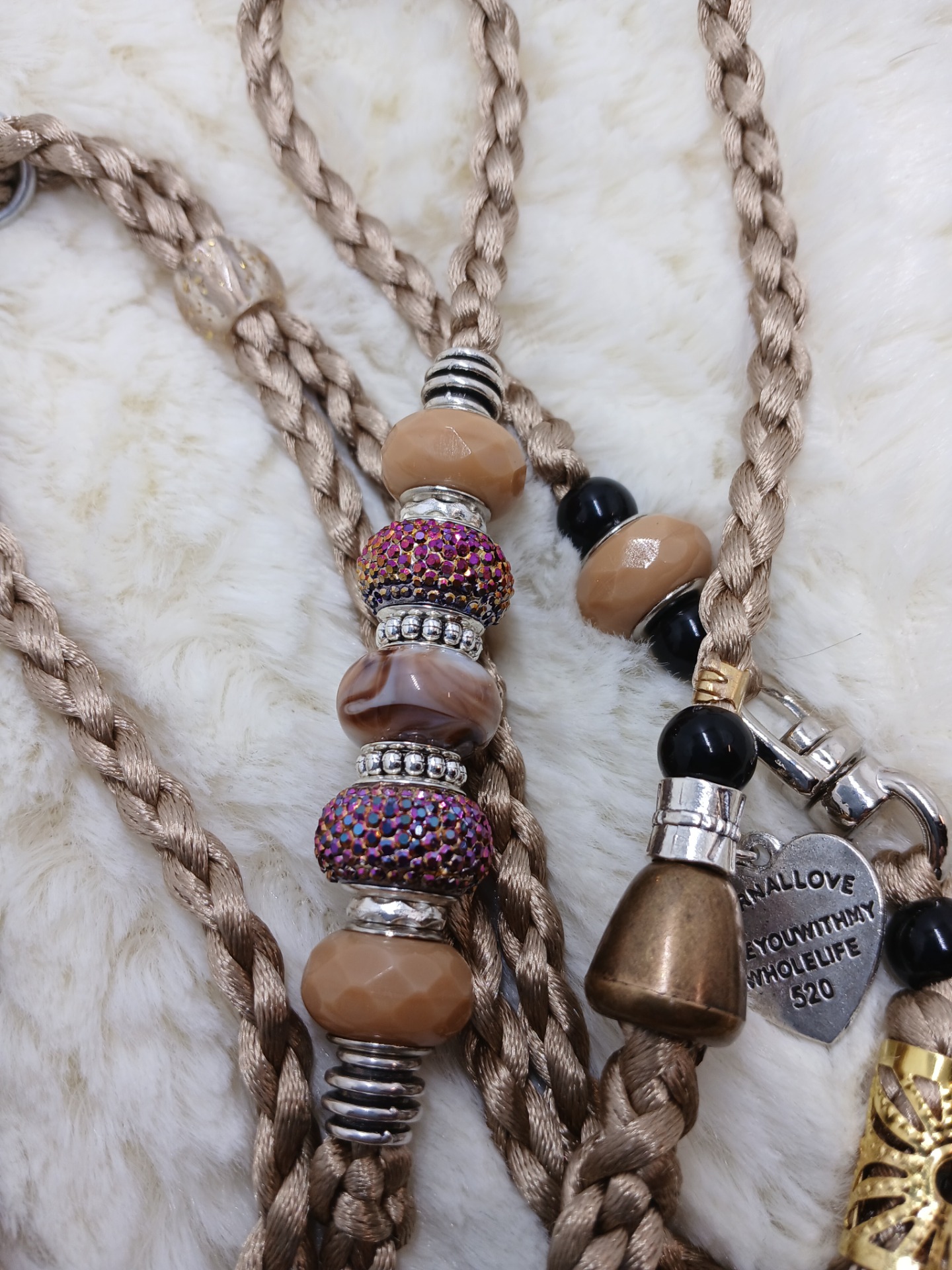 Výstavní vodítko v béžové barvě zakončené na smyčku, zdobené korálky.
