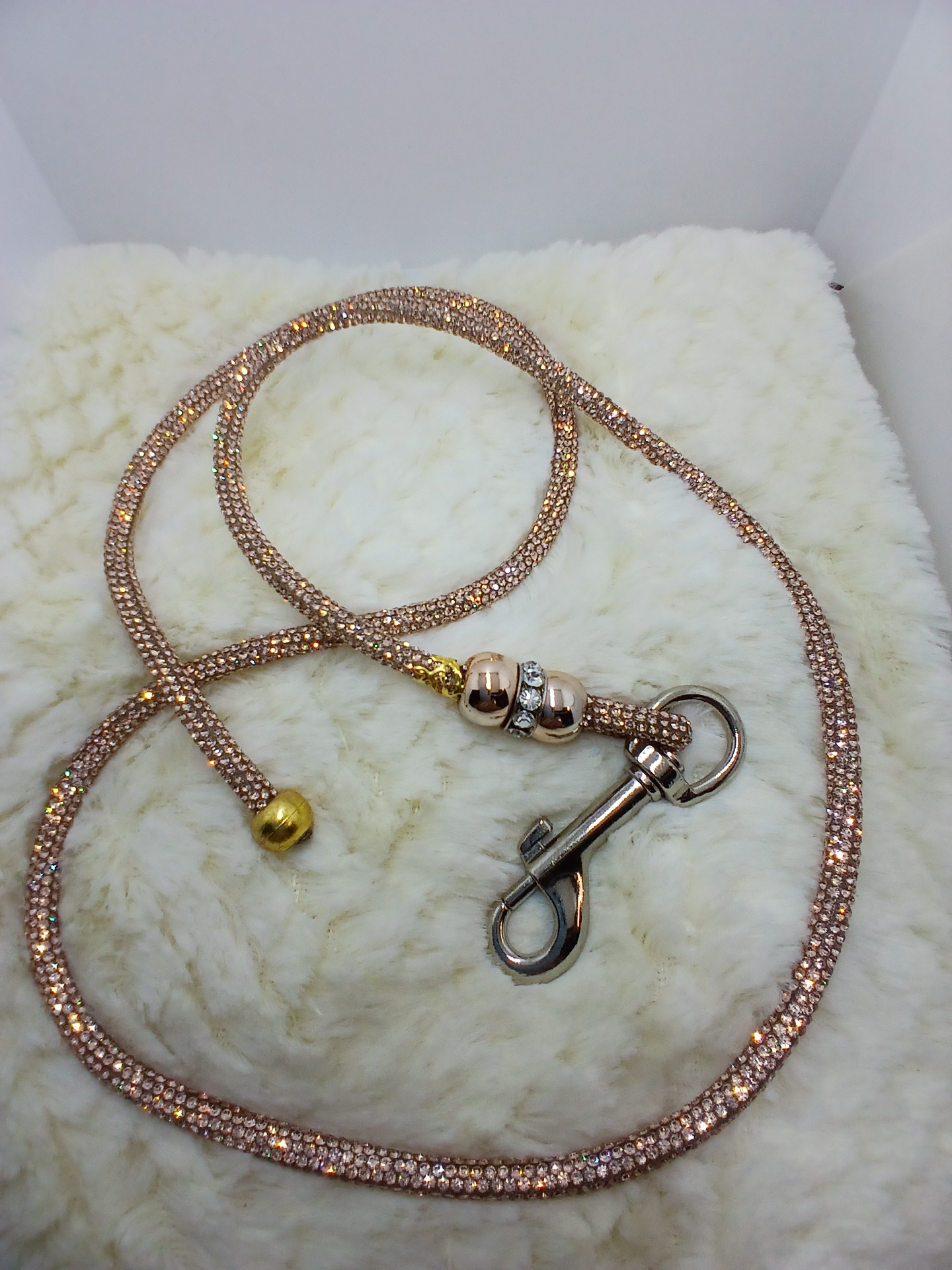 Výstavní kamínkové vodítko v zlaté barvě zakončené na karabinu . Délka vodítka 107 cm i s karabinou .