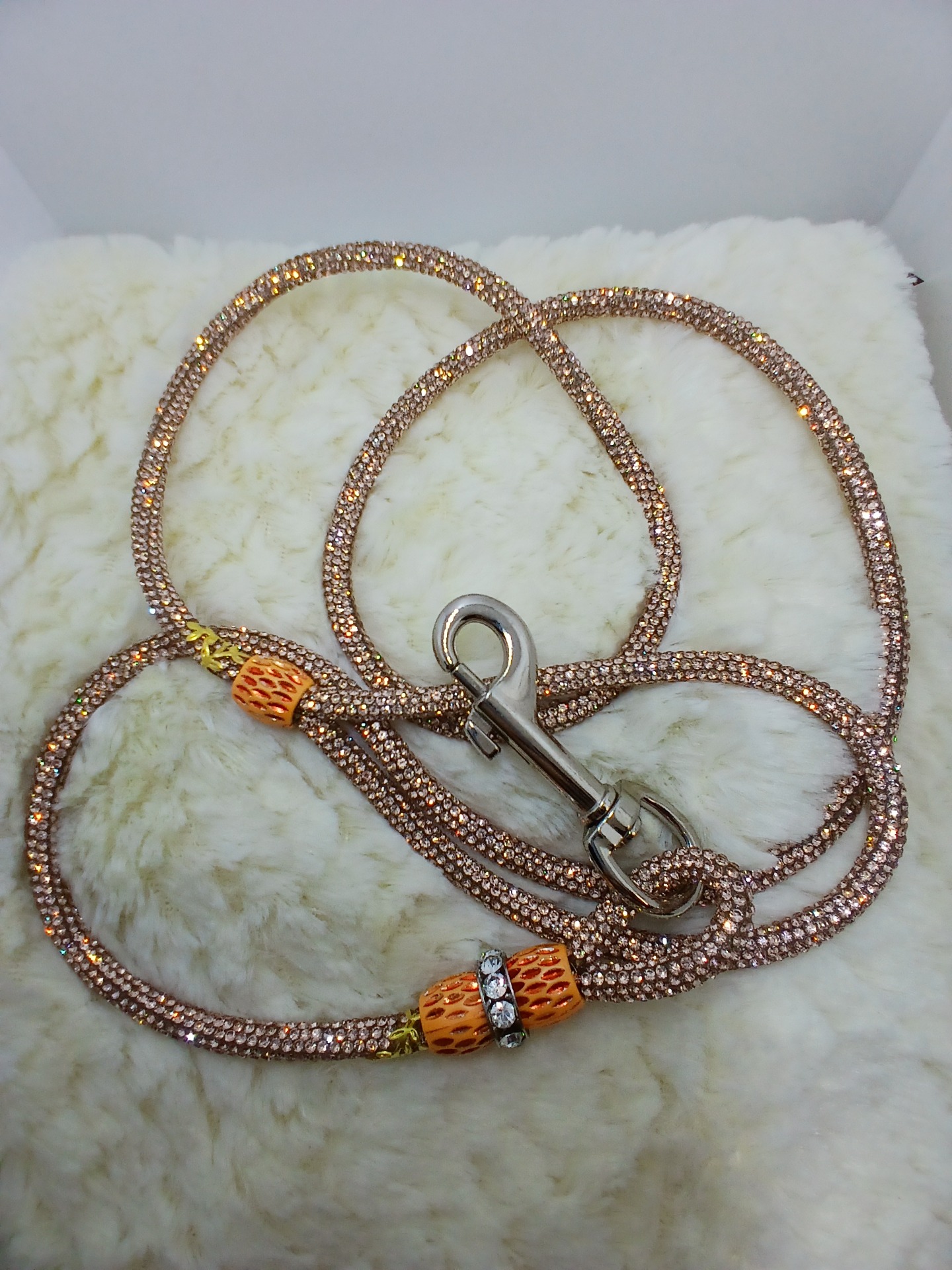 Výstavní kamínkové vodítko v zlaté barvě zakončené na karabinu . Délka vodítka 115 cm i s karabinou .