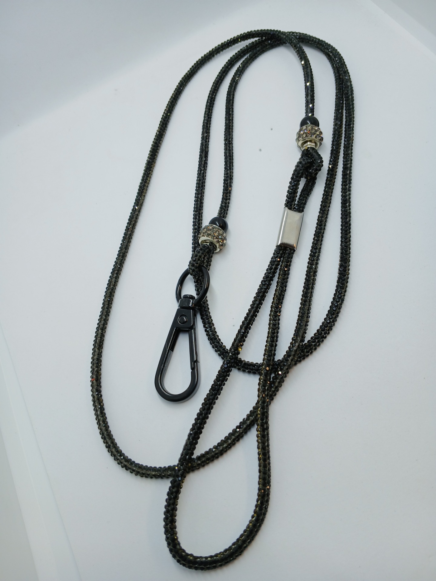 Výstavní kamínkové vodítko v černé barvě zakončené na karabinu . Délka vodítka 125 cm i s karabinou .