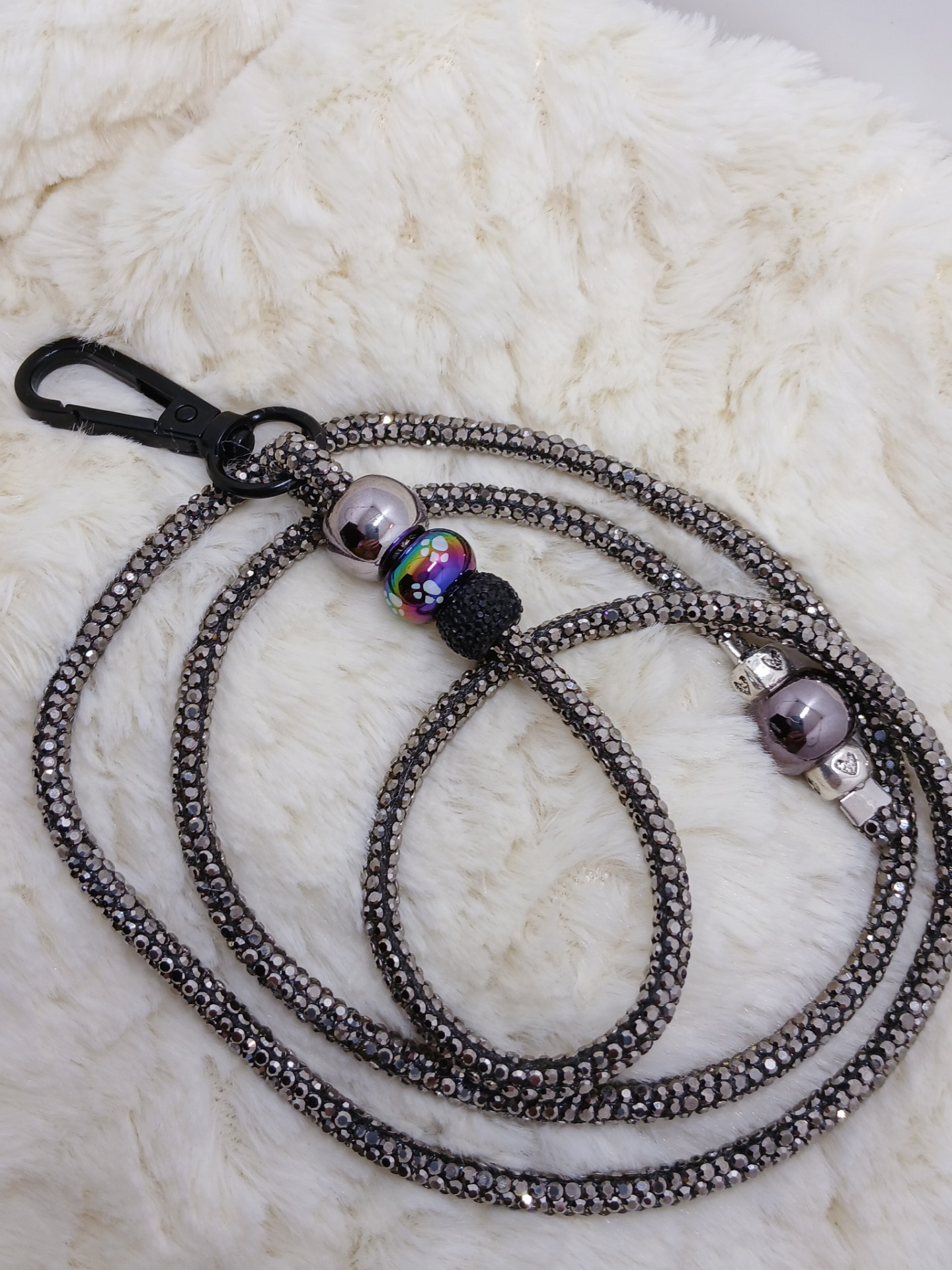 Výstavní kamínkové vodítko v černé barvě zakončené na karabinu . Délka vodítka 92 cm i s karabinou .
