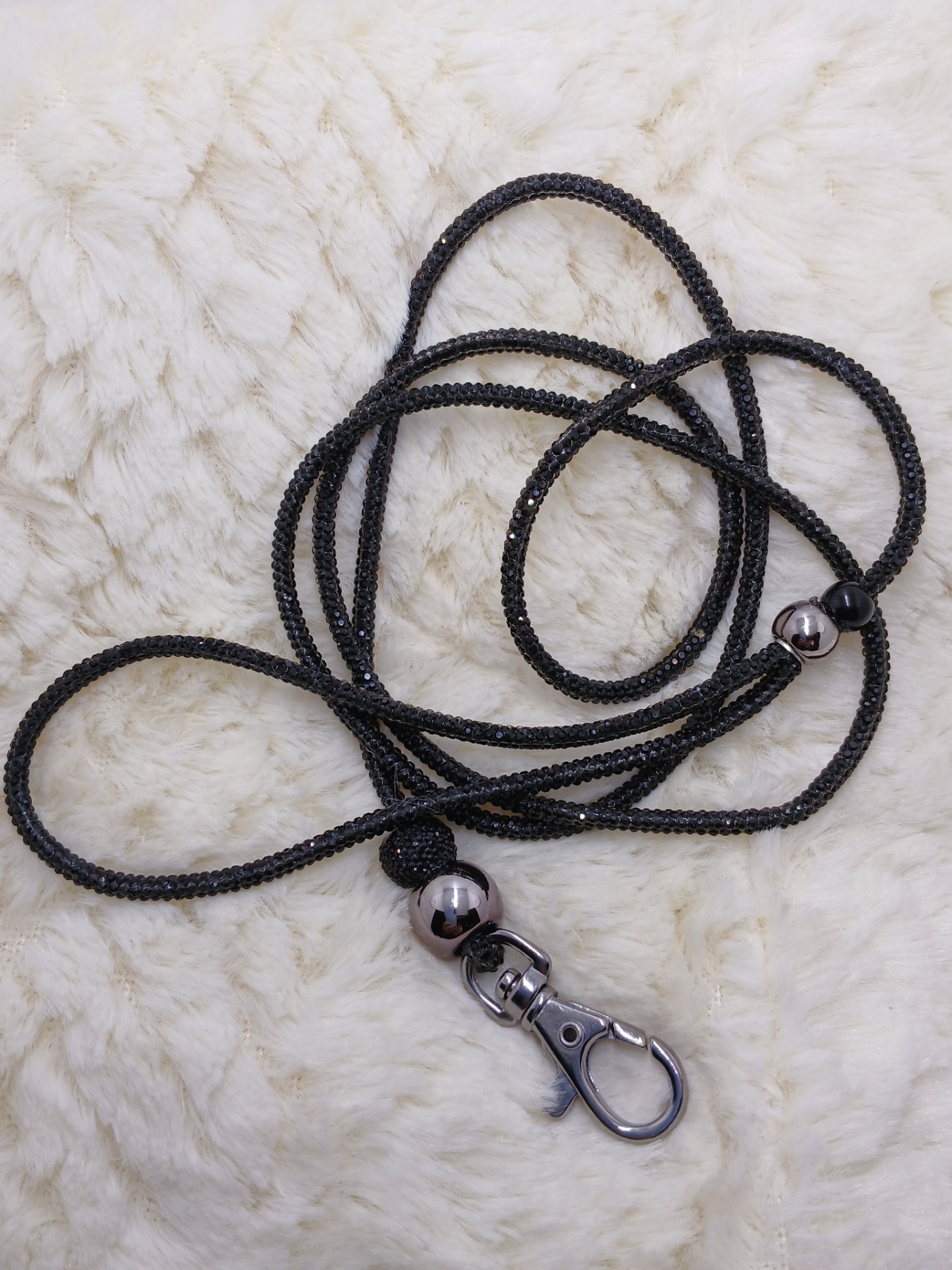 Výstavní kamínkové vodítko v černé barvě zakončené na karabinu . Délka vodítka 106 cm i s karabinou .